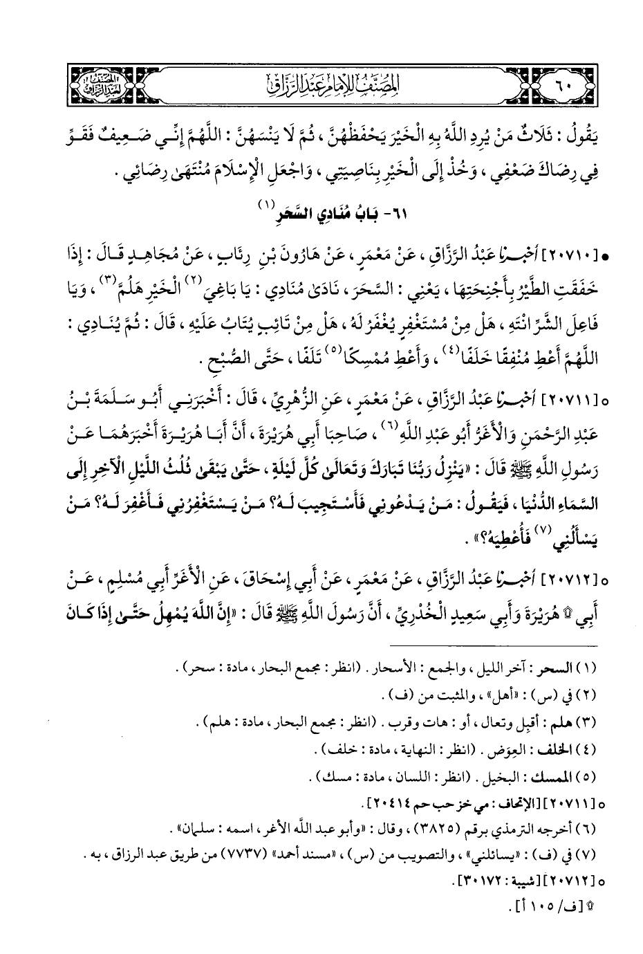• [٢٠٧١٠] أخبرنا عَبْدُ الرَّزَّاقِ، عَنْ مَعْمَرٍ، عَنْ هَارُونَ بْنِ رِئَابٍ، عَنْ مُجَاهِدٍ قَالَ: إِذَا خَفَقَتِ الطَّيْرُ بِأَجْنِحَتِهَا، يَعْنِي: السَّحَرَ، نَادَى مُنَادِي: يَا بَاغِيَ (¬٢) الْخَيْرِ هَلُمَّ (¬٣)، وَيَا فَاعِلَ الشَّرِّ انْتَهِ، هَلْ مِنْ مُسْتَغْفِرٍ يُغْفَرُ لَه، هَلْ مِنْ تَائِبٍ يُتَابُ عَلَيْهِ، قَالَ: ثُمَّ يُنَادِي: اللَّهُمَّ أَعْطِ مُنْفِقًا خَلَفًا (¬٤)، وَأَعْطِ مُمْسِكًا (¬٥) تَلَفًا، حَتَّى الصُّبْحِ.