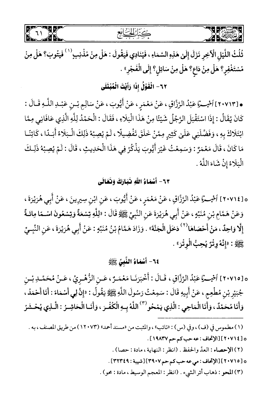 ° [٢٠٧١٤] أخبرنا عَبْدُ الرَّزاقِ، عَنْ مَعْمَرٍ، عَنْ أَيُّوبَ، عَنِ ابْنِ سِيرِينَ، عَنْ أَبِي هُرَيْرَةَ، وَعَنْ هَمَّامِ بْنِ مُنَبِّهٍ، عَنْ أَبِي هُرَيْرَةَ عَنِ النَّبِيِّ - صلى الله عليه وسلم - قالَ: "لِلهِ تِسْعَةٌ وَتِسْعُونَ اسْمًا مِائَةٌ إِلَّا وَاحِدٌ، مَنْ أَحْصَاهَا (¬٢) دَخَلَ الْجَنَّةَ". وَزَادَ هَمَّامُ بْنُ مُنَبِّهٍ: عَنْ أَبِي هُرَيْرَةَ، عَنِ النَّبِيِّ - صلى الله عليه وسلم -: "إِنَّهُ وِتْرٌ يُحِبُّ الْوِترَ".