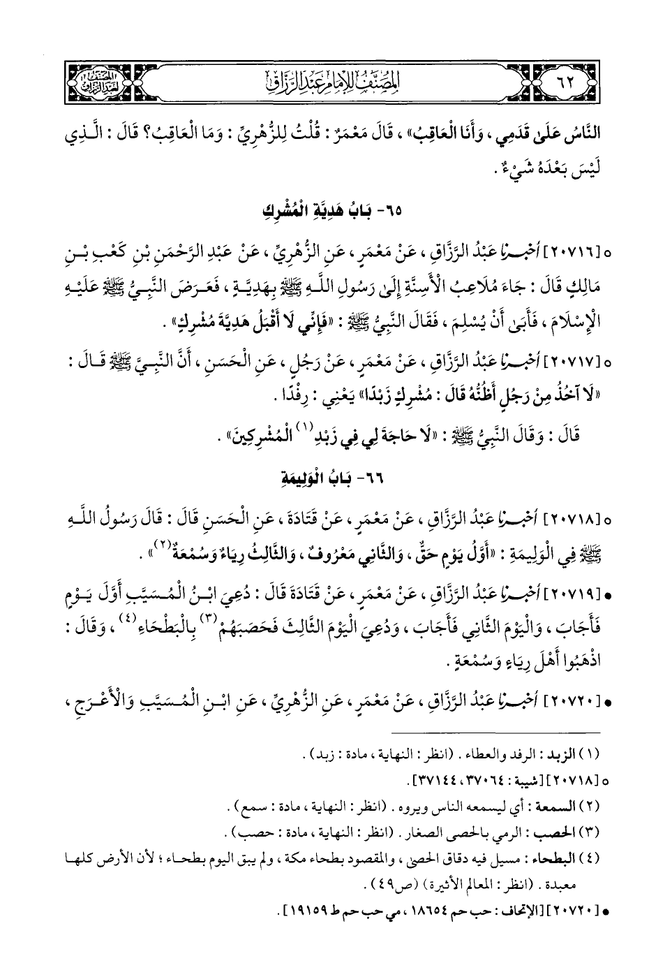 ° [٢٠٧١٨] أخبرنا عَبْدُ الرَّزَّاقِ، عَنْ مَعْمَرٍ، عَنْ قَتَادَةَ، عَنِ الْحَسَنِ قَالَ: قَالَ رَسُولُ اللهِ - صلى الله عليه وسلم - فِي الْوَلِيمَةِ: "أَوَّلُ يَوْمٍ حَقٌّ، وَالثَّانِي مَعْرُوفٌ، وَالثَّالِثُ رِيَاءٌ وَسُمْعَةٌ (¬٢) ".