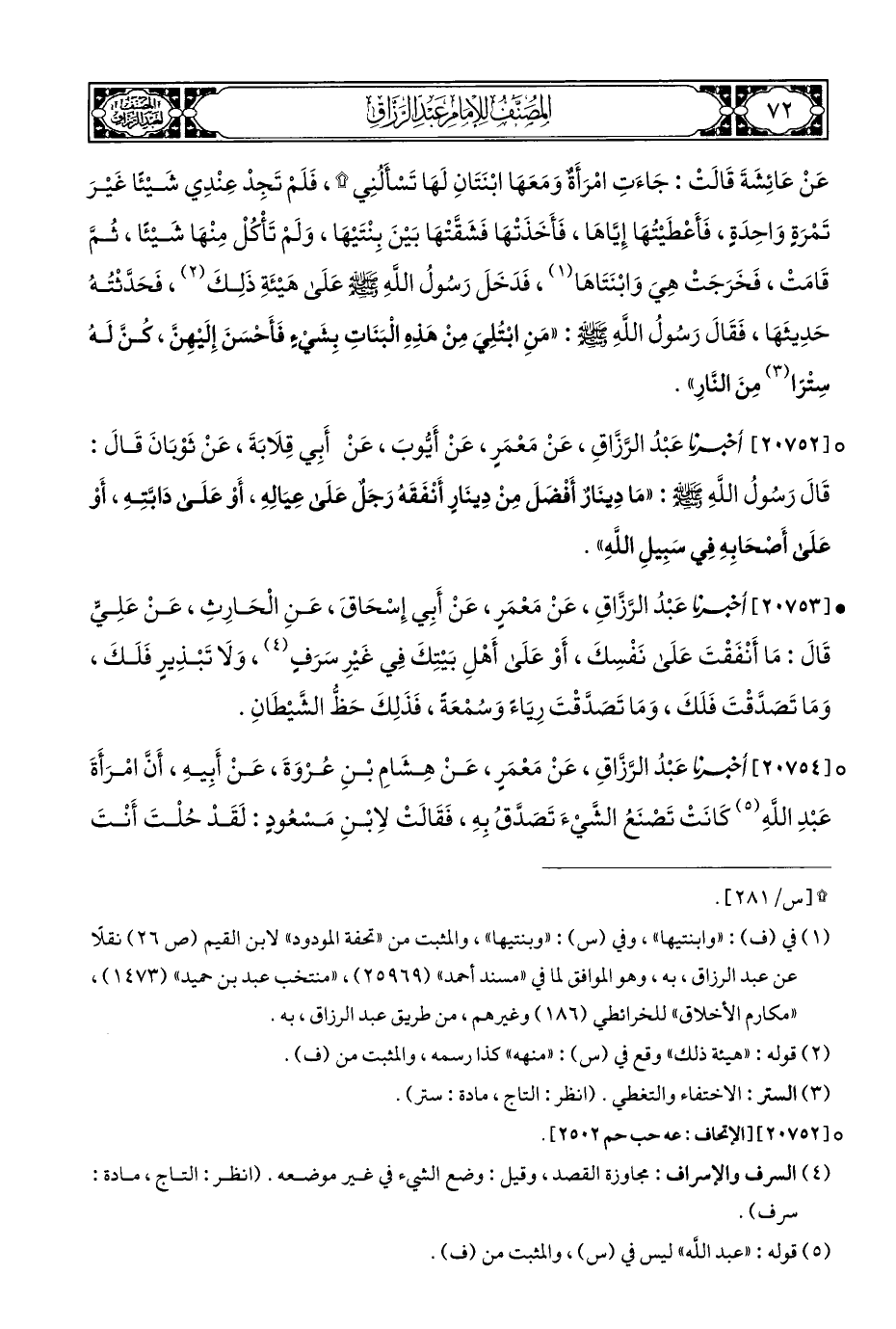° [٢٠٧٥٢] أخبرنا عَبْدُ الرَّزَّاقِ، عَنْ مَعْمَرٍ، عَنْ أَيُّوبَ، عَنْ أَبِي قِلَابَةَ، عَنْ ثَوْبَانَ قَالَ: قَالَ رَسُولُ اللَّهِ - صلى الله عليه وسلم -: "مَا دِينَارٌ أَفْضَلَ مِنْ دِينَارٍ أَنْفَقَهُ رَجَلٌ عَلَى عِيَالِهِ، أَوْ عَلَى دَابَّتِهِ، أَوْ عَلَى أَصْحَابِهِ فِي سَبِيلِ اللهِ".