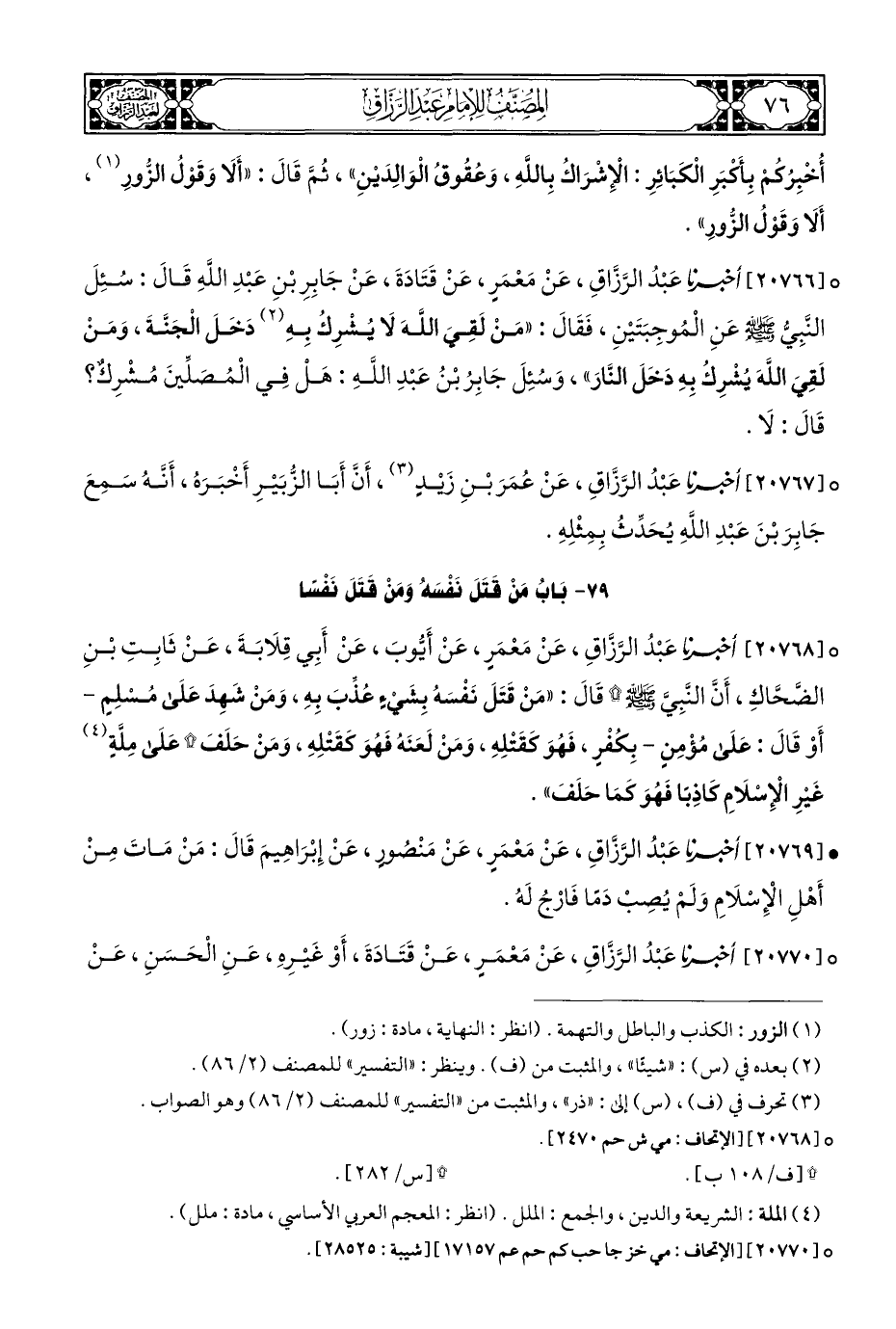 ° [٢٠٧٦٧] أخبرنا عَبْدُ الرَّزَّاقِ، عَنْ عُمَرَ بْنِ زَيْدٍ (¬٣)، أَنَّ أَبَا الزُّبَيْرِ أَخْبَرَه، أَنَّهُ سَمِعَ جَابِرَ بْنَ عَبْدِ اللَّهِ يُحَدِّثُ بِمِثْلِهِ.