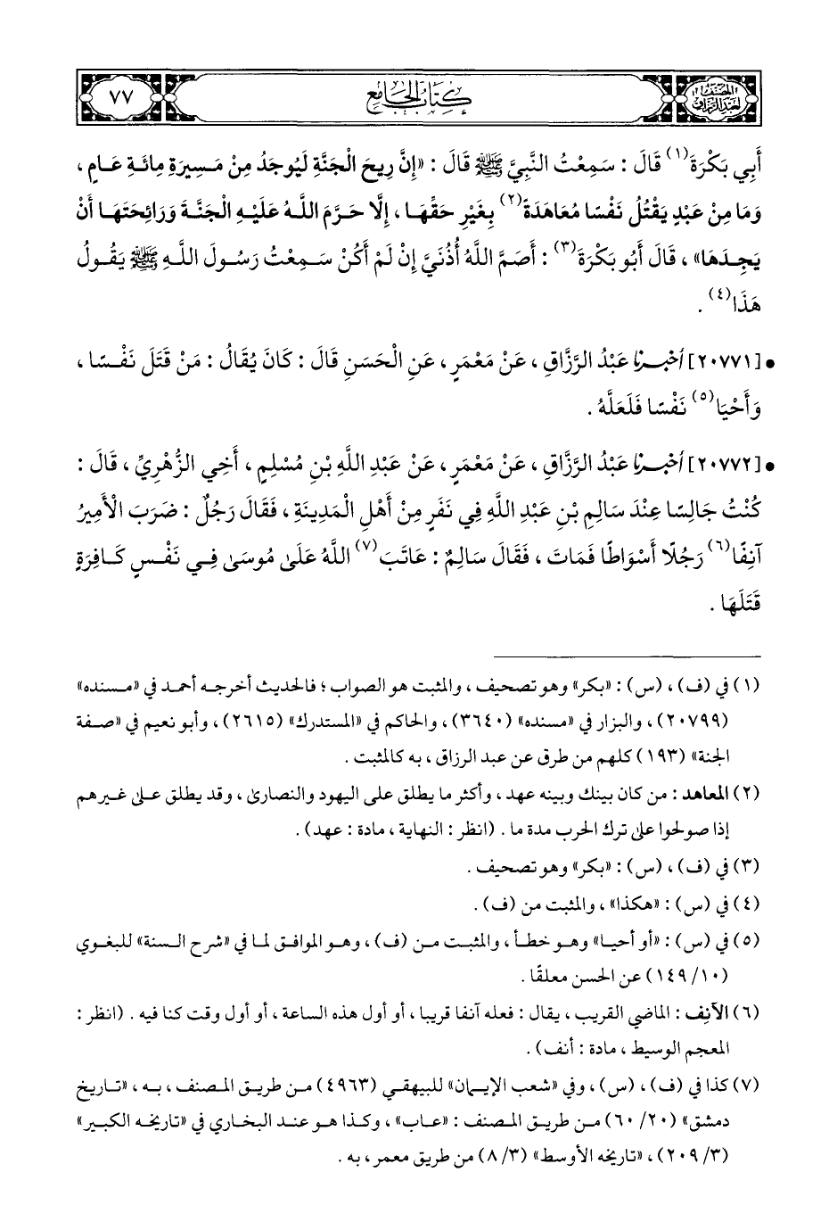 أَبِي بَكْرَةَ (¬١) قَالَ: سَمِعْتُ النَّبِيَّ - صلى الله عليه وسلم - قَالَ: "إِنَّ رِيحَ الْجَنَّةِ لَيُوجَدُ مِنْ مَسِيرَةِ مِائَةِ عَامٍ، وَمَا مِنْ عَبْدٍ يَقْتُلُ نَفْسًا مُعَاهَدَةً (¬٢) بِغَيْرِ حَقِّهَا، إِلَّا حَرَّمَ اللهُ عَلَيْهِ الْجَنَّةَ وَرَائِحَتَهَا أَنْ يَجِدَهَا"، قَالَ أَبُو بَكْرَةَ (¬٣): أَصَمَّ اللَّهُ أُذُنَيَّ إِنْ لَمْ أكُنْ سَمِعْتُ رَسُولَ اللهِ - صلى الله عليه وسلم - يَقُولُ هَذَا (¬٤).