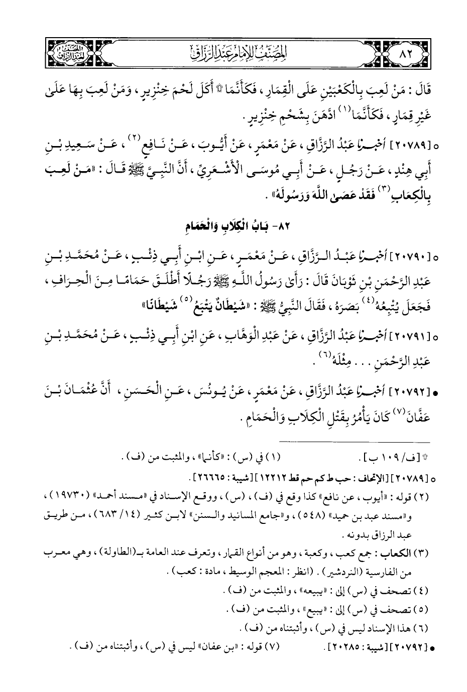 ° [٢٠٧٨٩] أخبرنا عَبْدُ الرَّزَّاقِ، عَنْ مَعْمَرٍ، عَنْ أَيُّوبَ، عَنْ نَافِعٍ (¬٢)، عَنْ سَعِيدِ بْنِ أَبِي هِنْدٍ، عَنْ رَجُلٍ، عَنْ أَبِي مُوسَى الْأَشْعَرِيِّ، أَنَّ النَّبِيَّ - صلى الله عليه وسلم - قَالَ: "مَنْ لَعِبَ بِالْكِعَابِ (¬٣) فَقَدْ عَصَى اللَّهَ وَرَسُولَهُ".