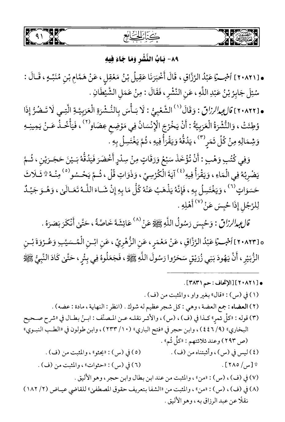 • [٢٠٨٢٢] قال عَبْدُ الرَّزَّاقِ: وَقَالَ (¬١) الشَّعْبِيُّ: لَا بَأْسَ بِالنُّشْرَةِ الْعَرَبِيَّةِ الَّتِي لَا تَضُرُّ إِذَا وُطِئَتْ، وَالنُّشْرَةُ الْعَرَبِيَّةُ: أَنْ يَخْرُجَ الْإِنْسَانُ فِي مَوْضِعِ عِضَاهٍ (¬٢)، فَيَأْخُذُ عَنْ يَمِينِهِ وَشِمَالِهِ مِنْ كُلِّ ثَمَرٍ (¬٣)، يَدُقُّهُ وَيَقْرَأُ فِيهِ، ثُمَّ يَغْتَسِلُ بِهِ.