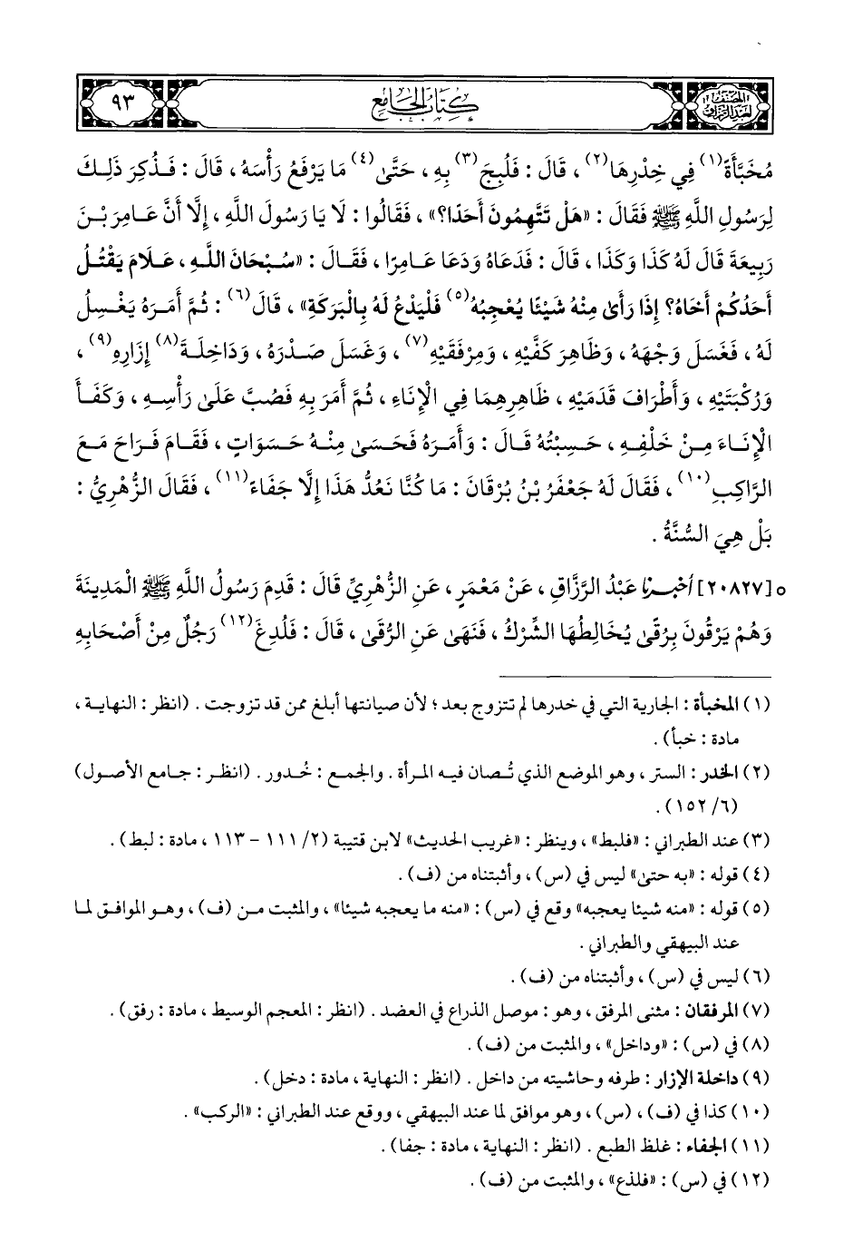 مُخَبَّأَةً (¬١) فِي خِدْرِهَا (¬٢)، قَالَ: فَلُبِجَ (¬٣) بِهِ، حَتَّى (¬٤) مَا يَرْفَعُ رَأْسَه، قَالَ: فَذُكِرَ ذَلِكَ لِرَسُولِ اللَّهِ - صلى الله عليه وسلم - فَقَالَ: "هَلْ تَتَّهِمُونَ أَحَدًا؟ "، فَقَالُوا: لَا يَا رَسُولَ اللَّهِ، إِلَّا أَنَّ عَامِرَ بْنَ رَبِيعَةَ قَالَ لَهُ كَذَا وَكَذَا، قَالَ: فَدَعَاهُ وَدَعَا عَامِرًا، فَقَالَ: "سُبْحَانَ اللهِ، عَلَامَ يَقْتُلُ أَحَدُكُمْ أَخَاهُ؟ إِذَا رَأَى مِنْهُ شَيْئًا يُعْجِبُهُ (¬٥) فَلْيَدْعُ لَهُ بِالْبَرَكَةِ"، قَالَ (¬٦): ثُمَّ أَمَرَهُ يَغْسِلُ لَه، فَغَسَلَ وَجْهَه، وَظَاهِرَ كَفَّيْهِ، وَمِرْفَقَيْهِ (¬٧)، وَغَسَلَ صَدْرَه، وَدَاخِلَةَ (¬٨) إِزَارِهِ (¬٩)، وَرُكْبَتَيْهِ، وَأَطْرَافَ قَدَمَيْهِ، ظَاهِرِهِمَا فِي الْإِنَاءِ، ثُمَّ أَمَرَ بِهِ فَصُبَّ عَلَى رَأْسِهِ، وَكَفَأَ الْإِنَاءَ مِنْ خَلْفِهِ، حَسِبْتُهُ قَالَ: وَأَمَرَهُ فَحَسَى مِنْهُ حَسَوَاتٍ، فَقَامَ فَرَاحَ مَعَ الرَّاكِبِ (¬١٠)، فَقَالَ لَهُ جَعْفَرُ بْنُ بُرْقَانَ: مَا كُنَّا نَعُدُّ هَذَا إِلَّا جَفَاءً (¬١١)، فَقَالَ الزُّهْرِيُّ: بَلْ هِيَ السُّنَّةُ.