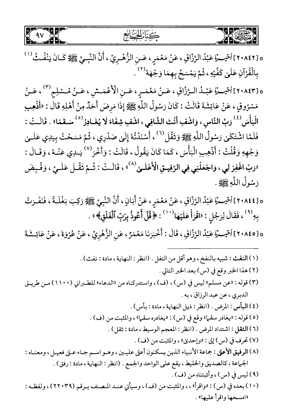 ° [٢٠٨٤٢] أخبرنا عَبْدُ الرَّزَّاقِ، عَنْ مَعْمَرٍ، عَنِ الزُّهْرِيِّ، أَنَّ النَّبِيَّ - صلى الله عليه وسلم - كَانَ يَنْفُثُ (¬١) بِالْقُرْآنِ عَلَى كَفَّيْهِ، ثُمَّ يَمْسَحُ بِهِمَا وَجْهَهُ (¬٢).