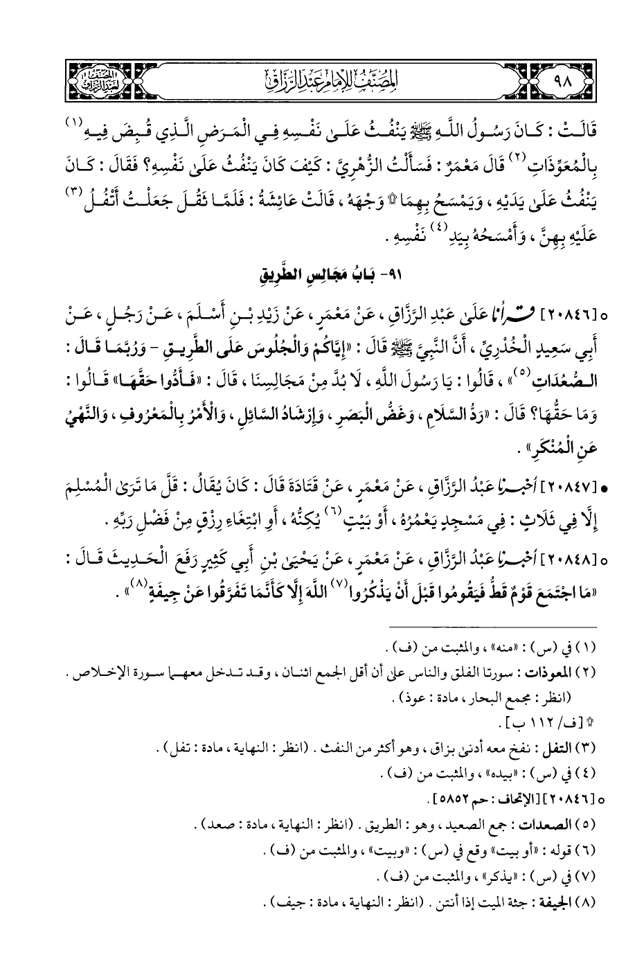 ° [٢٠٨٤٦] قرأنا عَبْدُ الرَّزَّاقِ، عَنْ مَعْمَرٍ، عَنْ زَيْدِ بْنِ أَسْلَمَ، عَنْ رَجُلٍ، عَنْ أَبِي سَعِيدٍ الْخُدْرِيِّ، أَنَّ النَّبِيَّ - صلى الله عليه وسلم - قَالَ: "إِيَّاكُمْ وَالْجُلُوسَ عَلَى الطَّرِيقِ - وَرُبَّمَا قَالَ: الصُّعُدَاتِ (¬٥) "، قَالُوا: يَا رَسُولَ اللَّهِ، لَا بُدَّ مِنْ مَجَالِسِنَا، قَالَ: "فَأَدُّوا حَقَّهَا" قَالُوا: وَمَا حَقُّهَا؟ قَالَ: "رَدُّ السَّلَامِ، وَغَضُّ الْبَصَرِ، وَإرْشَادُ السَّائِلِ، وَالْأَمْرُ بِالْمَعْرُوفِ، وَالنَّهْيُ عَنِ الْمُنْكَرِ".