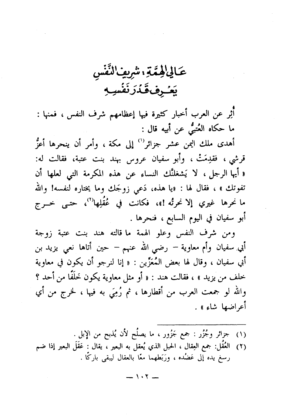 أهدى ملك اليمن عشر جزائر (¬1) إلى مكة، وأمر أن ينحرها أعزُّ قرشي، فقدِمَتْ، وأبو سفيان عروس بهند بنت عتبة، فقالت له: "أيها الرجل، لا يَشغلنَّك النساء عن هذه المكرمة التى لعلها أن تفوتك"، فقال لها: "يا هذه، دَعي زوجَك وما يختاره لنفسه! والله ما نحرها غيرى إلا نحرتُه! "، فكانت في عُقُلِها (¬2)، حتى خرج أبو سفيان في اليوم السابع، فنحرها.