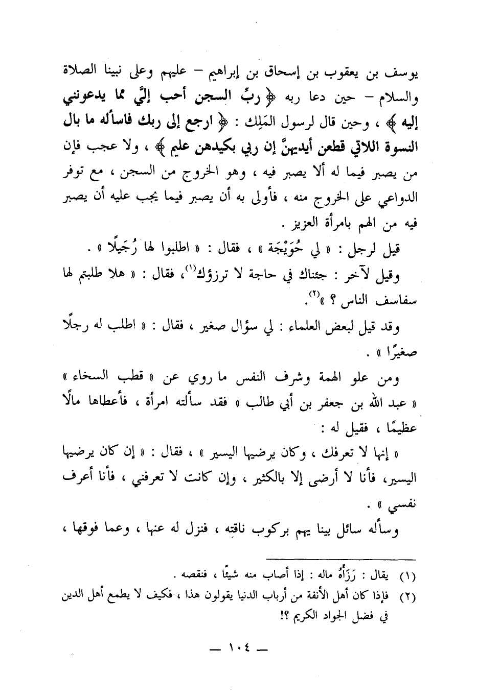 وقيل لآخر: جئناك في حاجة لا ترزؤك (¬1)، فقال: "هلا طلبتم لها سفاسف الناس؟ " (¬2).