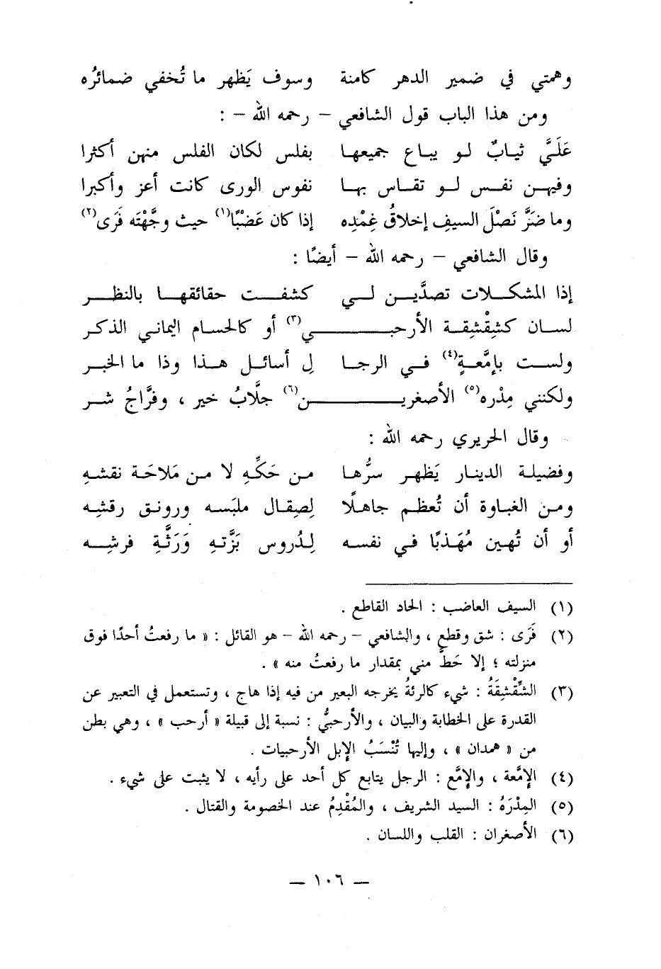 (¬2) فَرَى: شق وقطع، والشافعي -رحمه الله- هو القائل: "ما رفعتُ أحدًا فوق منزلته؛ إلا حَطَّ مني بمقدار ما رفعتُ منه".