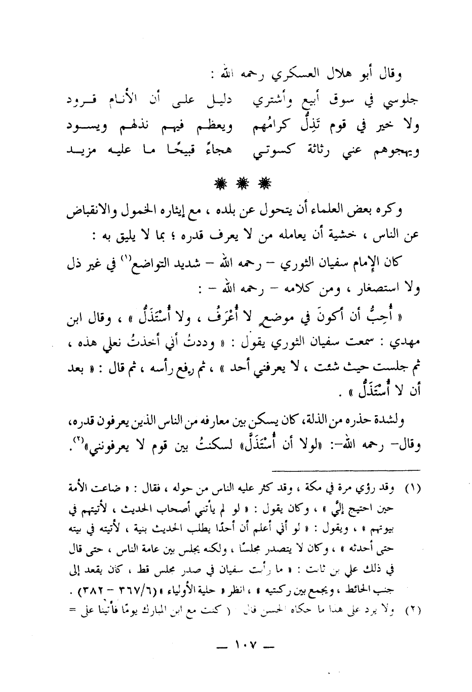 "أحِبُّ أن أكونَ في موضعٍ لا أُعْرَفُ، ولا أُسْتَذَلُّ"، وقال ابن مهدي: سمعت سفيان الثوري يقول: "وددتُ أني أخذتُ نعلي هذه، ثم جلست حيث شئت، لا يعرفني أحد"، ثم رفع رأسه، ثم قال: "بعد أن لا أُسْتَذَلُّ".