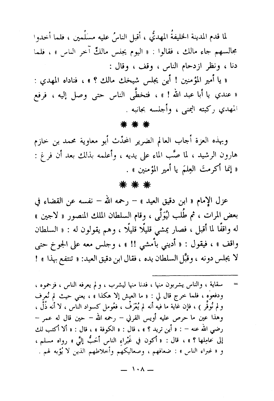 عزل الإمام "ابن دقيق العيد" -رحمه الله- نفسه عن القضاء في بعض المرات، ثم طُلب ليُوَلِّى، وقام السلطان الملك المنصور "لاجين" له واقفًا لما أقبل، فصار يمشى قليلًا قليلًا، وهم يقولون له: "السلطان واقف"، فيقول: "أديني بأمشى!! "، وجلس معه على الجوخ حتى لا يجلس دونه، وقبَّل السلطان يده، فقال ابن دقيق العيد: "تنتفع بهذا"!