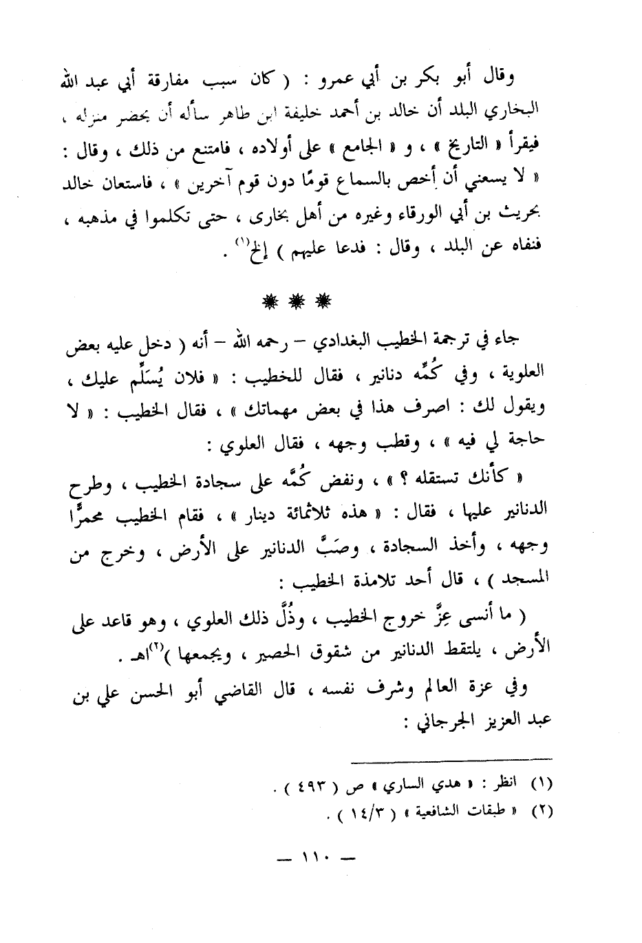 جاء في ترجمة الخطيب البغدادي -رحمه الله- أنه (دخل عليه بعض العلوية، وفي كُمِّه دنانير، فقال للخطيب: "فلان يُسَلِّم عليك، ويقول لك: اصرف هذا في بعض مهماتك"، فقال الخطيب: "لا حاجة لي فيه"، وقطب وجهه، فقال العلوي: