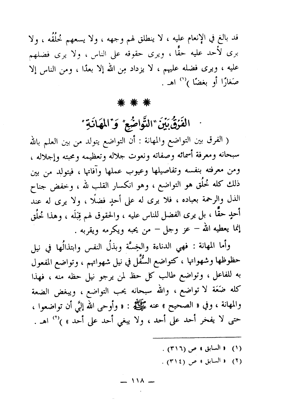 (الفرق بين التواضع والمهانة: أن التواضع يتولد من بين العلم بالله سبحانه ومعرفة أسمائه وصفاته ونعوت جلاله وتعظيمه ومحبته وإجلاله، ومن معرفته بنفسه وتفاصيلها وعيوب عملها وآفاتها، فيتولد من بين ذلك كله خُلُق هو التواضع، وهو انكسار القلب لله، وخفض جناح الذل والرحمة بعباده، فلا يرى له على أحدٍ فضلاً، ولا يرى له عند أحد حقًّا، بل يرى الفضل للناس عليه، والحقوق لهم قِبَلَه، وهذا خُلُق إنما يعطيه الله -عز وجل- ما يحبه ويكرمه ويقربه.