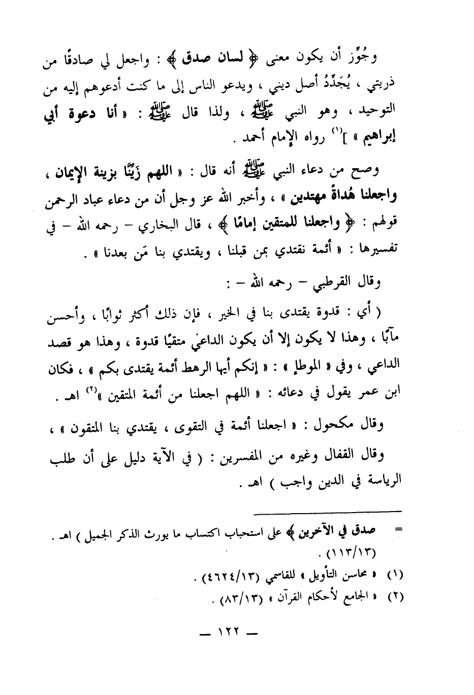 وقال مكحول: "اجعلنا أئمة في التقوى، يقتدي بنا المتقون"، وقال القفال وغيره من المفسرين: (في الآية دليل على أن طلب الرياسة في الدين واجب) اهـ.
