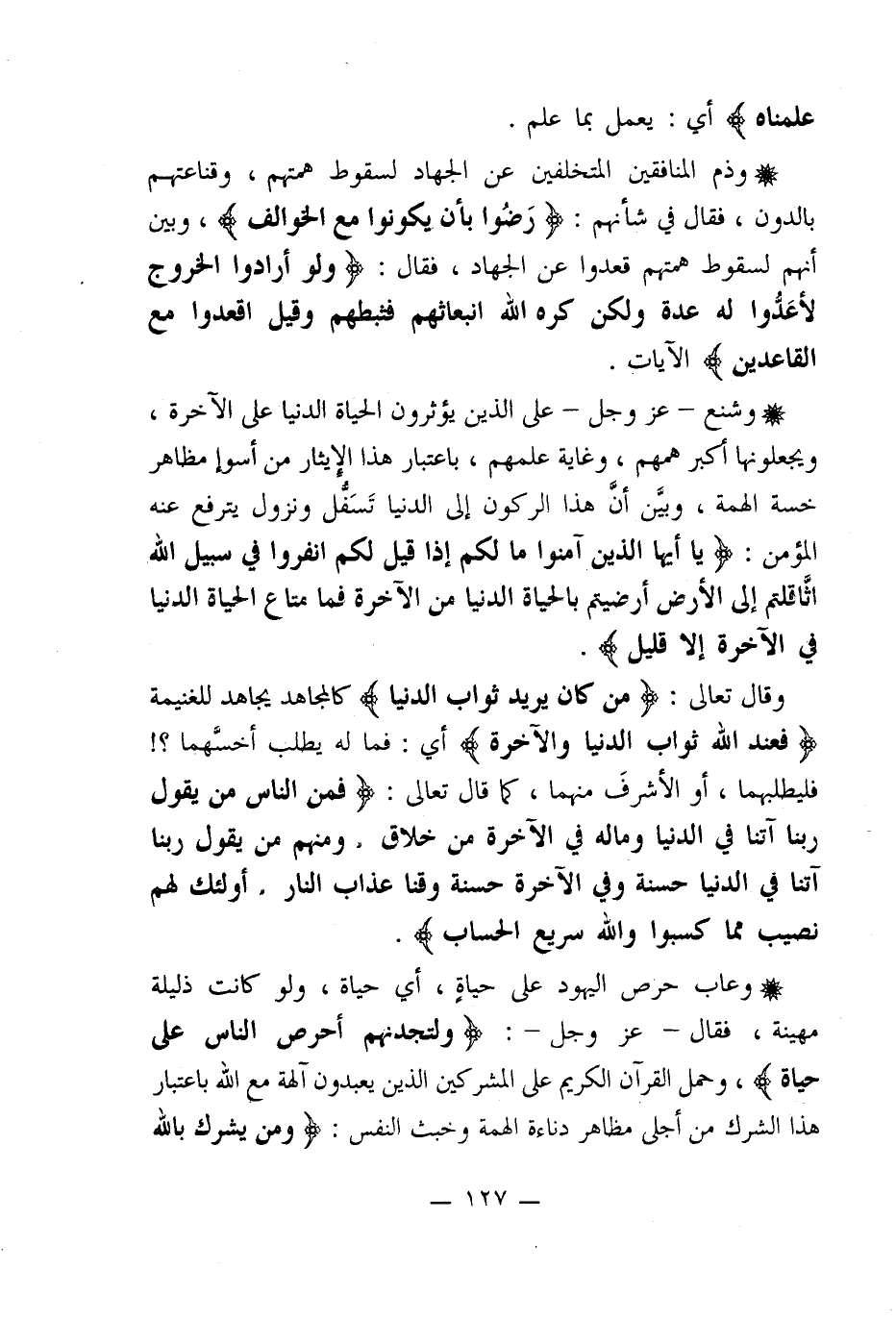 * وذم المنافقين المتخلفين عن الجهاد لسقوط همتهم، وقناعتهم بالدون، فقال في شأنهم: {رَضُوا بأن يكونوا مع الخوالف}، وبين أنهم لسقوط همتهم قعدوا عن الجهاد، فقال: {ولو أرادوا الخروج لأعَدُّوا له عدة ولكن كره الله انبعاثهم فثبطهم وقيل اقعدوا مع القاعدين} الآيات.