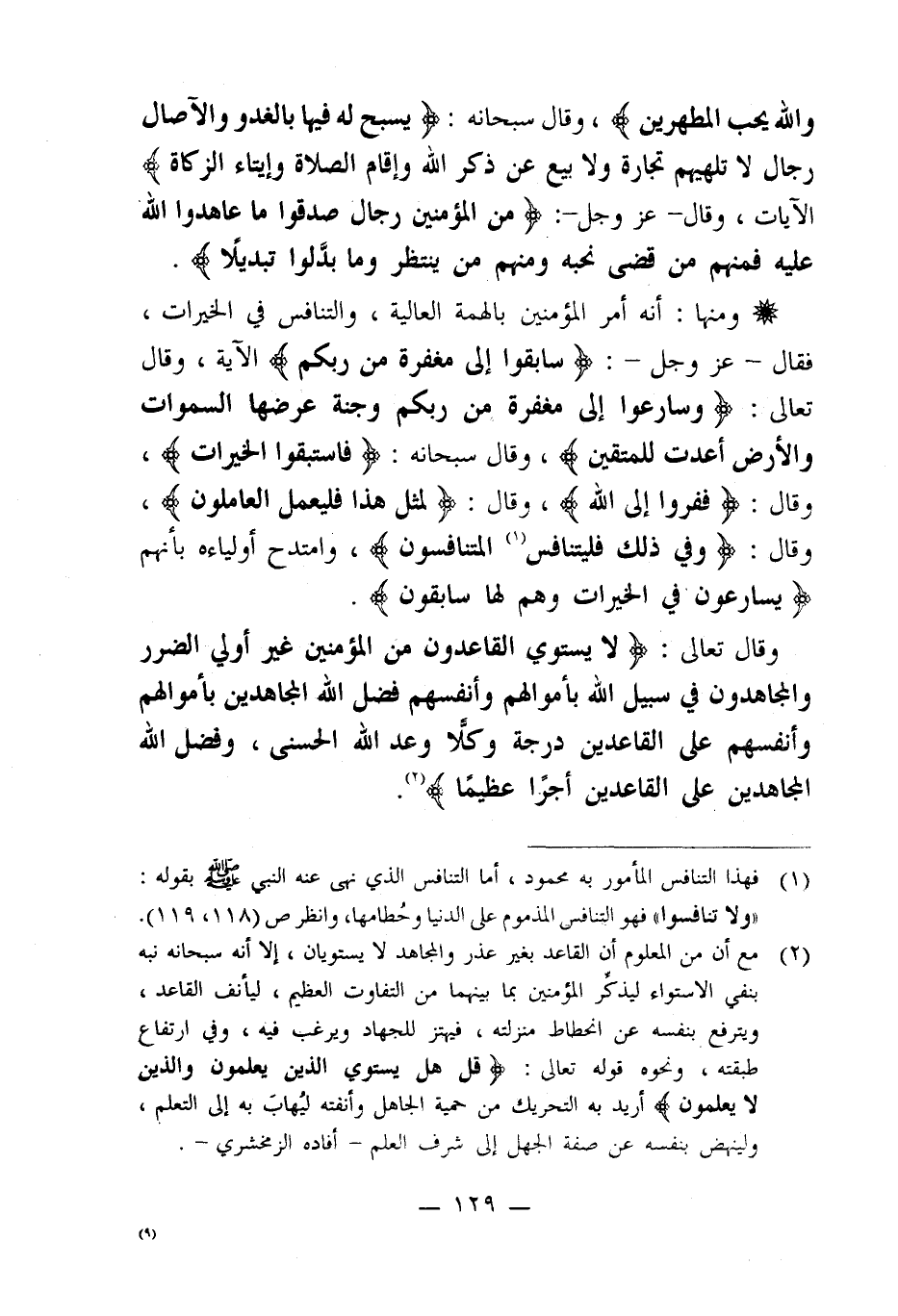 وقال تعالى: {لا يستوي القاعدون من المؤمنين غير أولي الضرر والمجاهدون في سبيل الله بأموالهم وأنفسهم فضل الله المجاهدين بأموالهم وأنفسهم على القاعدين درجة وكلًّا وعد الله الحسنى، وفضل الله المجاهدين على القاعدين أجرًا عظيمًا} (¬2).