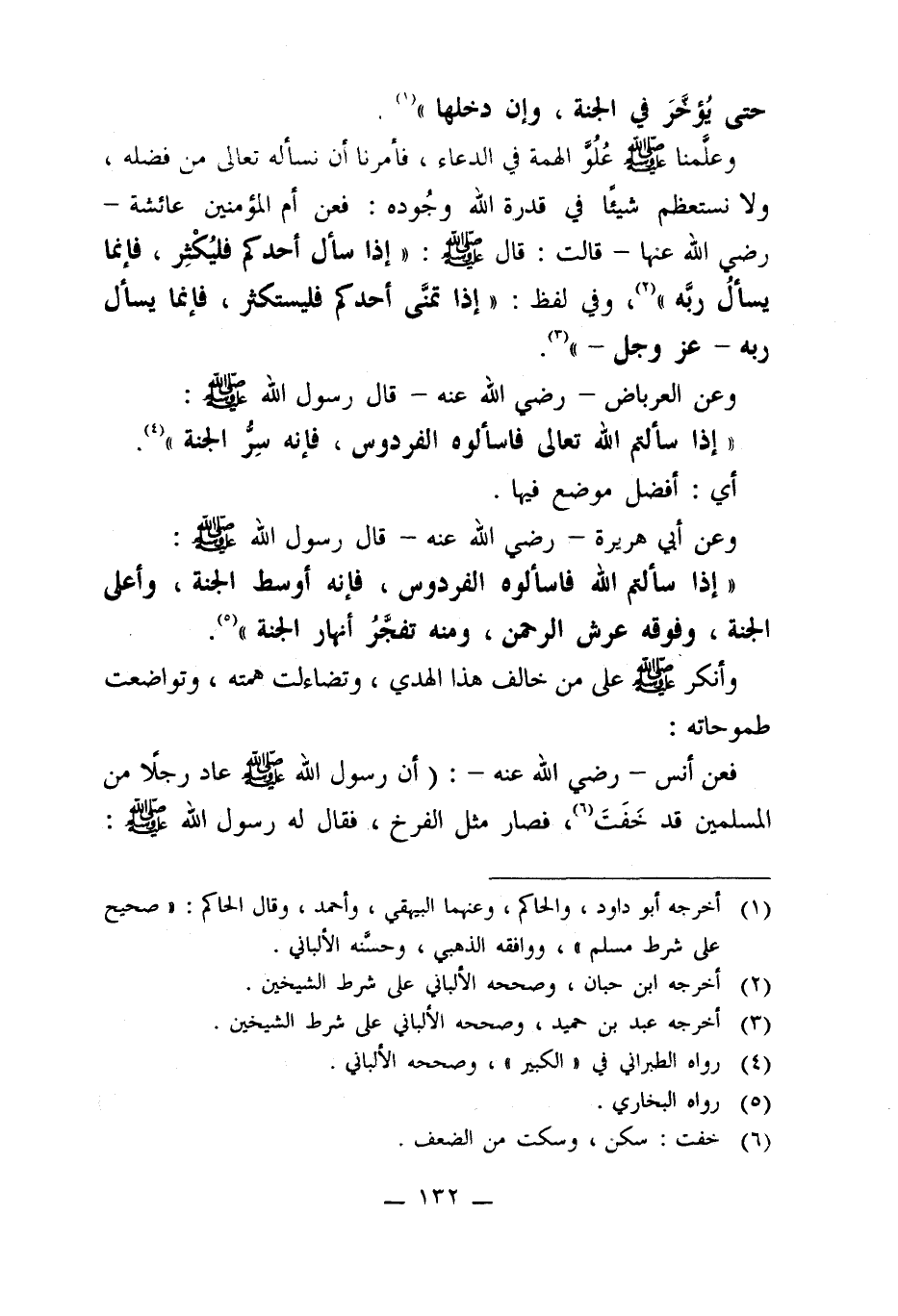 "إذا سألتم الله فاسألوه الفردوس، فإنه أوسط الجنة، وأعلى الجنة، وفوقه عرش الرحمن، ومنه تفجَّرُ أنهار الجنة" (¬5).