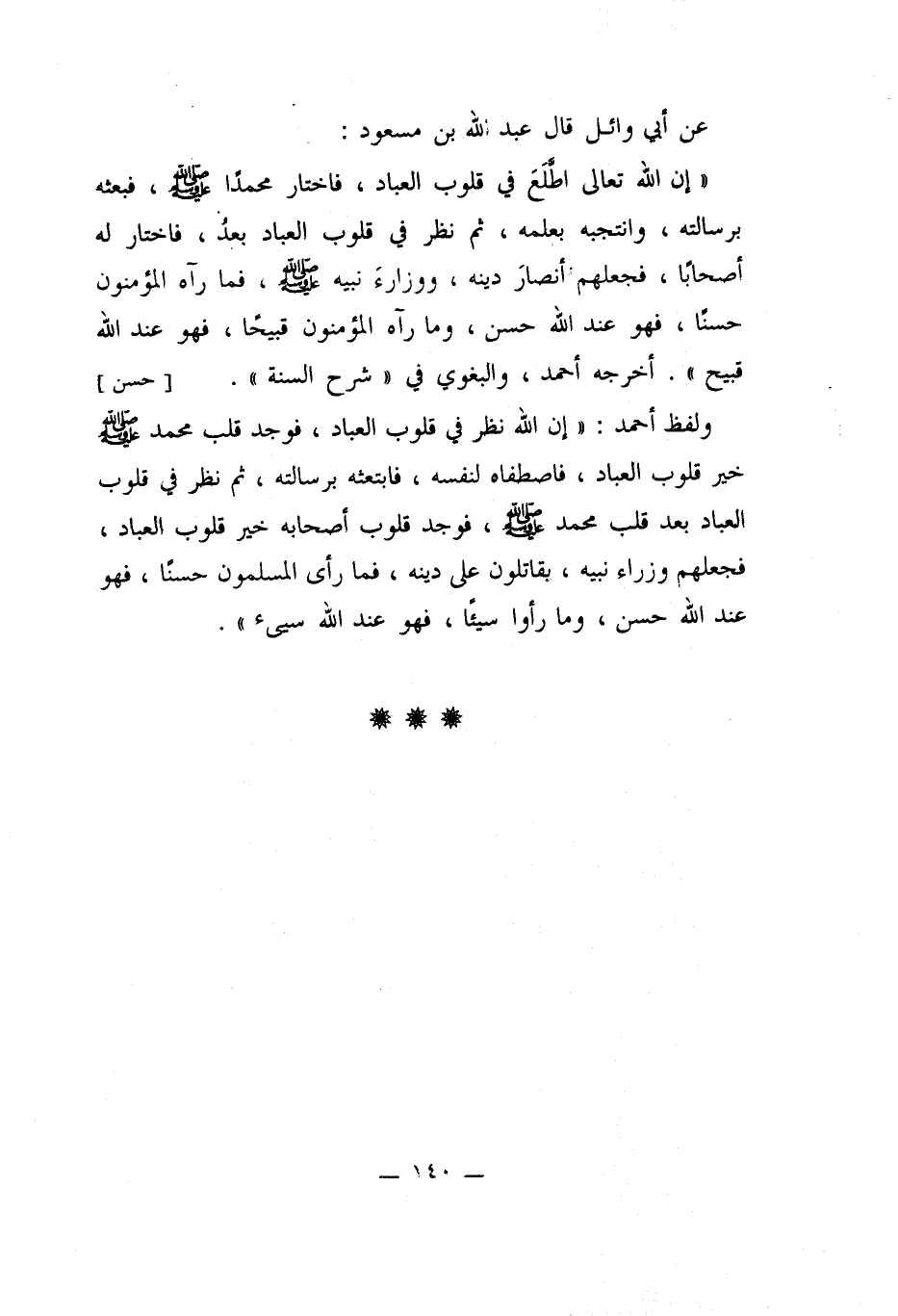 ولفظ أحمد: "إن الله نظر في قلوب العباد، فوجد قلب محمد - صلى الله عليه وسلم - خير قلوب العباد، فاصطفاه لنفسه، فابتعثه برسالته، ثم نظر في قلوب العباد بعد قلب محمد - صلى الله عليه وسلم -، فوجد قلوب أصحابه خير قلوب العباد، فجعلهم وزراء نبيه، يقاتلون على دينه، فما رأى المسلمون حسنًا، فهو عند الله حسن، وما رأوا سيئًا، فهو عند الله سيئ".