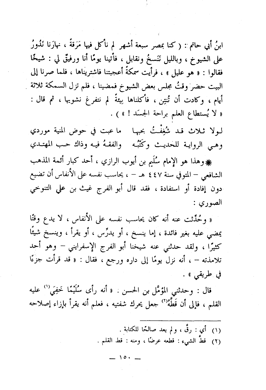 * وهذا هو الإمام سُلَيم بن أيوب الرازي، أحد كبار أئمة المذهب الشافعي -المتوفي سنة 447 هـ-، يحاسب نفسه على الأنفاس أن تضيع دون إفادة أو استفادة، فقد قال أبو الفرج غيث بن على التنوخي الصوري:
