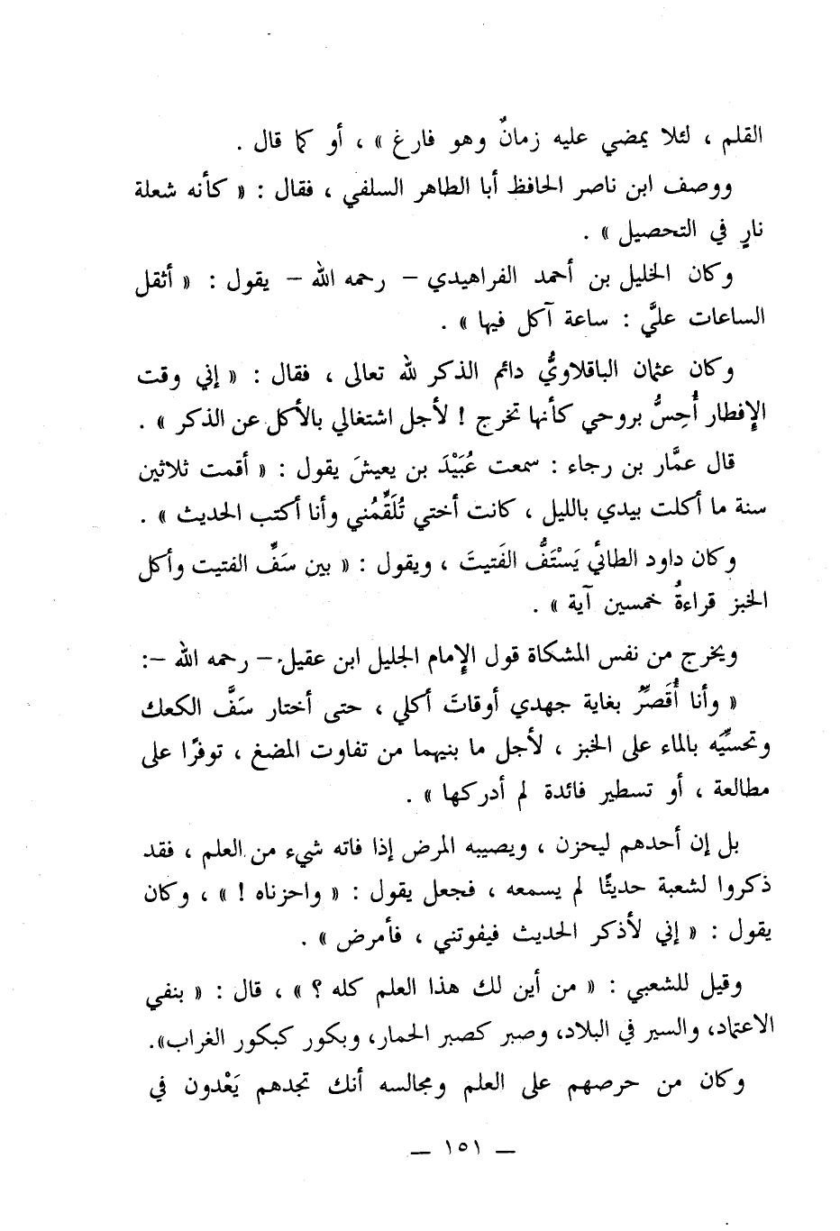 ويخرج من نفس المشكاة قول الإمام الجليل ابن عقيل -رحمه الله-: "وأنا أقَصِّرُ بغاية جهدي أوقاتَ أكلي، حتى أختار سَفَّ الكعك وتحسِّيَه بالماء على الخبز، لأجل ما بنيهما من تفاوت المضغ، توفرًا على مطالعة، أو تسطير فائدة لم أدركها".