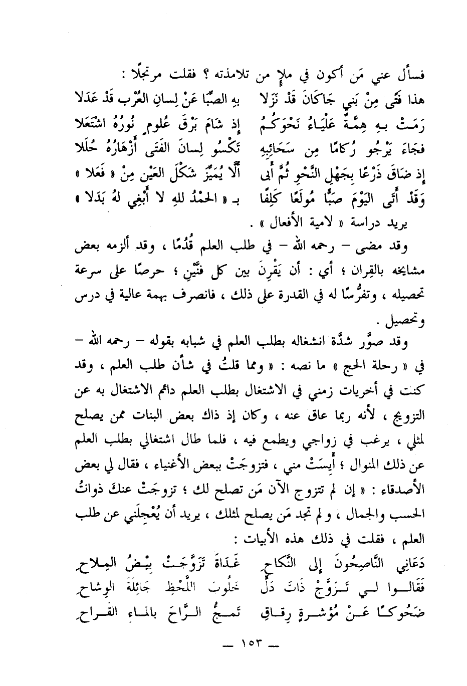وقد صوَّر شدَّة انشغاله بطلب العلم في شبابه بقوله -رحمه الله - في "رحلة الحج" ما نصه: "ومما قلتُ في شأن طلب العلم، وقد كنت في أخريات زمني في الاشتغال بطلب العلم دائم الاشتغال به عن التزويج، لأنه ربما عاق عنه، وكان إذ ذاك بعض البنات ممن يصلح لمثلي، يرغب في زواجي ويطمع فيه، فلما طال اشتغالي بطلب العلم عن ذلك المنوال؛ أَيِسَتْ مني، فتزوجَتْ ببعض الأغنياء، فقال لي بعض الأصدقاء: "إن لم تتزوج الآن مَن تصلح لك؛ تزوجتَ عنكَ ذواتُ الحسب والجمال، ولم تجد مَن يصلح لمثلك، يريد أن يُعْجِلَني عن طلب العلم، فقلت في ذلك هذه الأبيات: