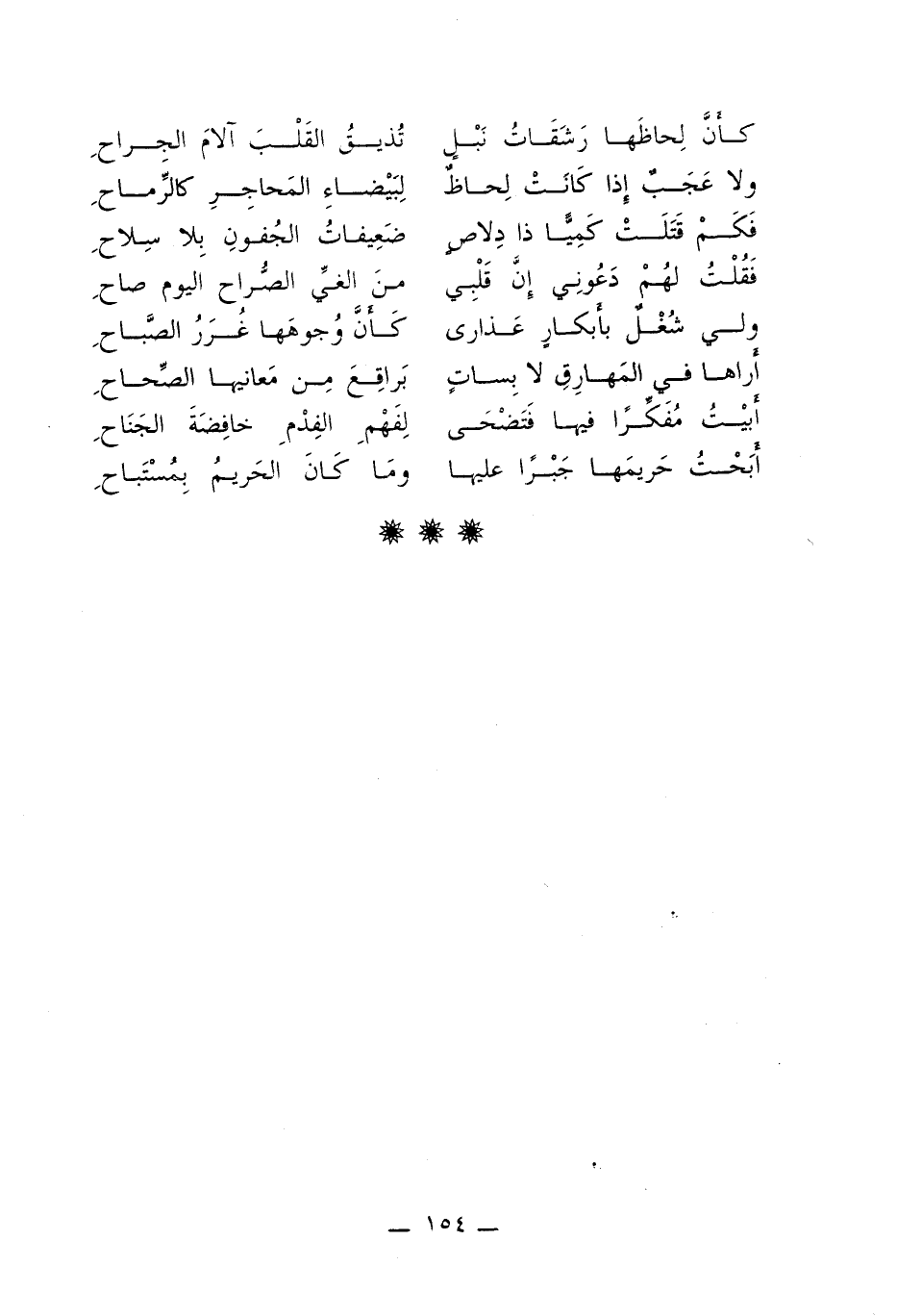 كأنَّ لِحاظَها رَشَقَاتُ نَبْلٍ ... تُذيقُ القَلْبَ آلامَ الجِراحِ