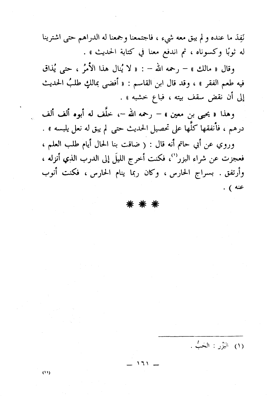 وروي عن أبى حاتم أنه قال: (ضاقت بنا الحال أيام طلب العلم، فعجزت عن شراء البزر (¬1)، فكنت أخرج الليلَ إلى الدرب الذي أنزله، وأرتفق. بسراج الحارس، وكان ربما ينام الحارس، فكنت أنوب عنه).