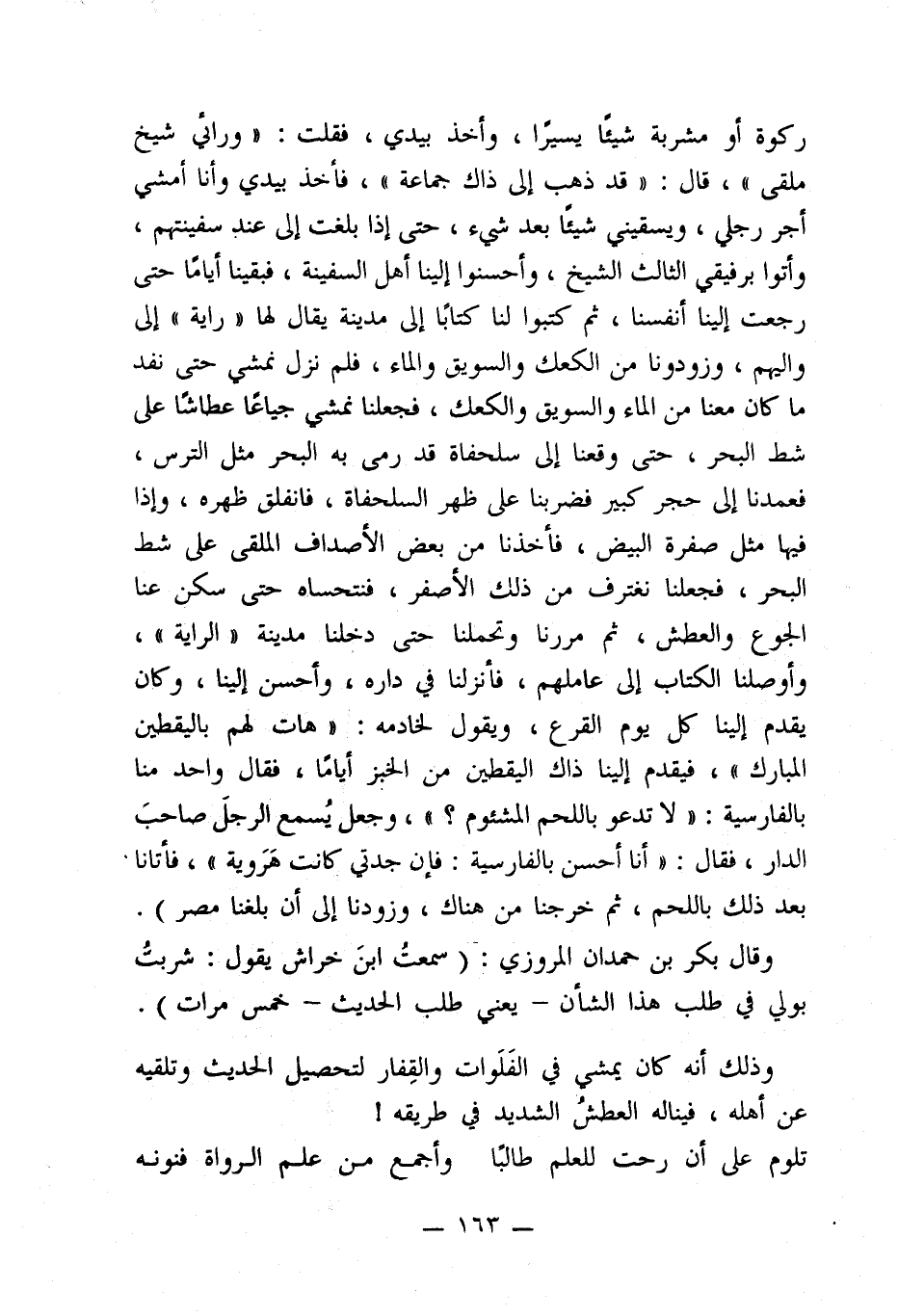 ركوة أو مشربة شيئًا يسيرًا، وأخذ بيدي، فقلت: "ورائي شيخ ملقى"، قال: "قد ذهب إلى ذاك جماعة"، فأخذ بيدي وأنا أمشي أجر رجلي، ويسقيني شيئًا بعد شيء، حتى إذا بلغت إلى عند سفينتهم، وأتوا برفيقي الثالث الشيخ، وأحسنوا إلينا أهل السفينة، فبقينا أيامًا حتى رجع إلينا أنفسنا، ثم كتبوا لنا كتابًا إلى مدينة يقال لها "راية" إلى واليهم، وزودونا من الكعك والسويق والماء، فلم نزل نمشي حتى نفد ما كان معنا من الماء والسويق والكعك، فجعلنا نمشي جياعًا عطاشًا على شط البحر، حتى وقعنا إلى سلحفاة قد رمى به البحر مثل الترس، فعمدنا إلى حجر كبير فضربنا على ظهر السلحفاة، فانفلق ظهره، وإذا فيها مثل صفرة البيض، فأخذنا من بعض الأصداف الملقى على شط البحر، فجعلنا نغترف من ذلك الأصفر، فنتحساه حتى سكن عنا الجوع والعطش، ثم مررنا وتحملنا حتى دخلنا مدينة "الراية"، وأوصلنا الكتاب إلى عاملهم، فأنزلنا في داره، وأحسن إلينا، وكان يقدم إلينا كل يوم القرع، ويقول لخادمه: "هات لهم باليقطين المبارك"، فيقدم إلينا ذاك اليقطين من الخبز أيامًا، فقال واحد منا بالفارسية: "لا تدعو باللحم المشئوم؟ "، وجعل يُسمع الرجلَ صاحبَ الدار، فقال: "أنا أحسن بالفارسية: فإن جدتي كانت هَرَويهّ"، فأتانا بعد ذلك باللحم، ثم خرجنا من هناك، وزودنا إلى أن بلغنا مصر).