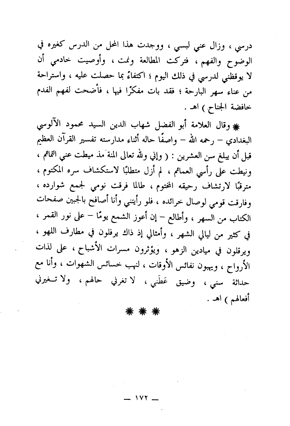 * وقال العلامة أبو الفضل شهاب الدين السيد محمود الآلوسي البغدادي -رحمه الله- واصفًا حاله أثناء مدارسته تفسير القرآن العظيم قبل أن يبلغ سن العشرين: (وإني ولله تعالى المنة مذ ميطت عني التمائم، ونيطت على رأسي العمائم، لم أزل متطلبًا لاستكشاف سره المكتوم، مترقبا لارتشاف رحيقه المختوم، طالما فرقت نومي لجمع شوارده، وفارقت قومي لوصال خرائده، فلو رأيتني وأنا أصافح بالجبين صفحات الكتاب من السهر، وأطالع -إن أعوز الشمع يومًا- على نور القمر، في كثير من ليالي الشهر، وأمثالي إذ ذاك يرفلون في مطارف اللهو، ويرقلون في ميادين الزهو، ويؤثرون مسرات الأشباح، على لذات الأرواح، ويهبون نفائس الأوقات، لنهب خسائس الشهوات، وأنا مع حداثة سني، وضيق عَطَني، لا تغرني حالهم، ولا تغيرني أفعالهم) اهـ.
