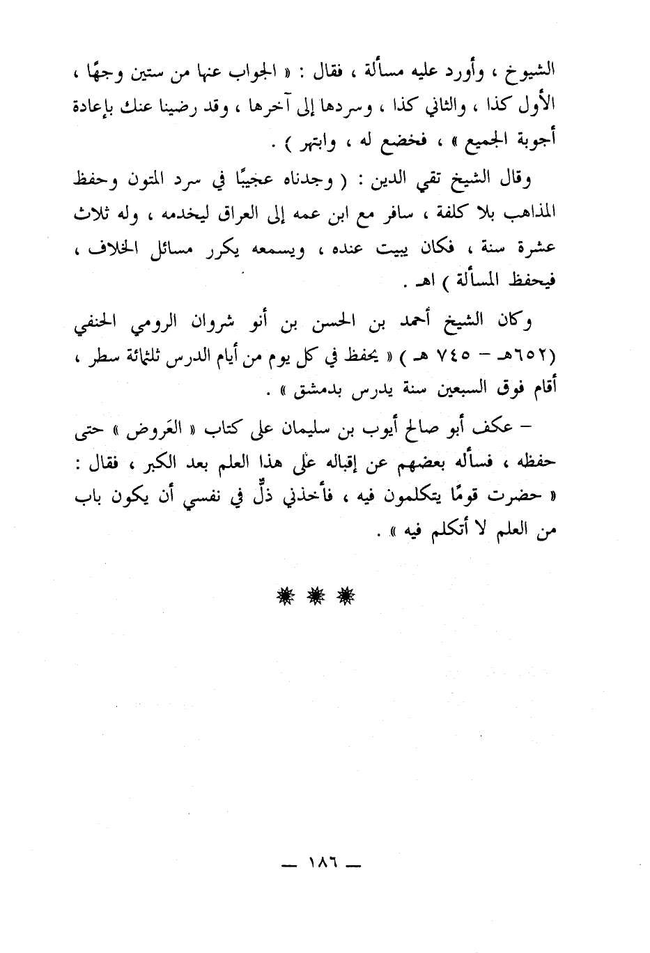 وكان الشيخ أحمد بن الحسن بن أنو شروان الرومي الحنفي (652 هـ - 745 هـ) "يحفظ في كل يوم من أيام الدرس ثلثمائة سطر، أقام فوق السبعين سنة يدرس بدمشق".