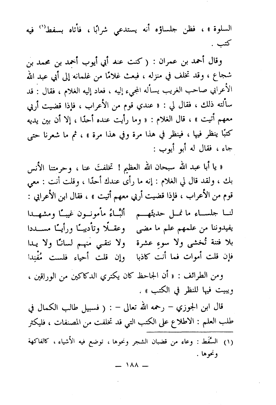 السلوة"، فظن جلساؤه أنه يستدعي شرابًا، فأتاه بسفط (¬1) فيه كتب.