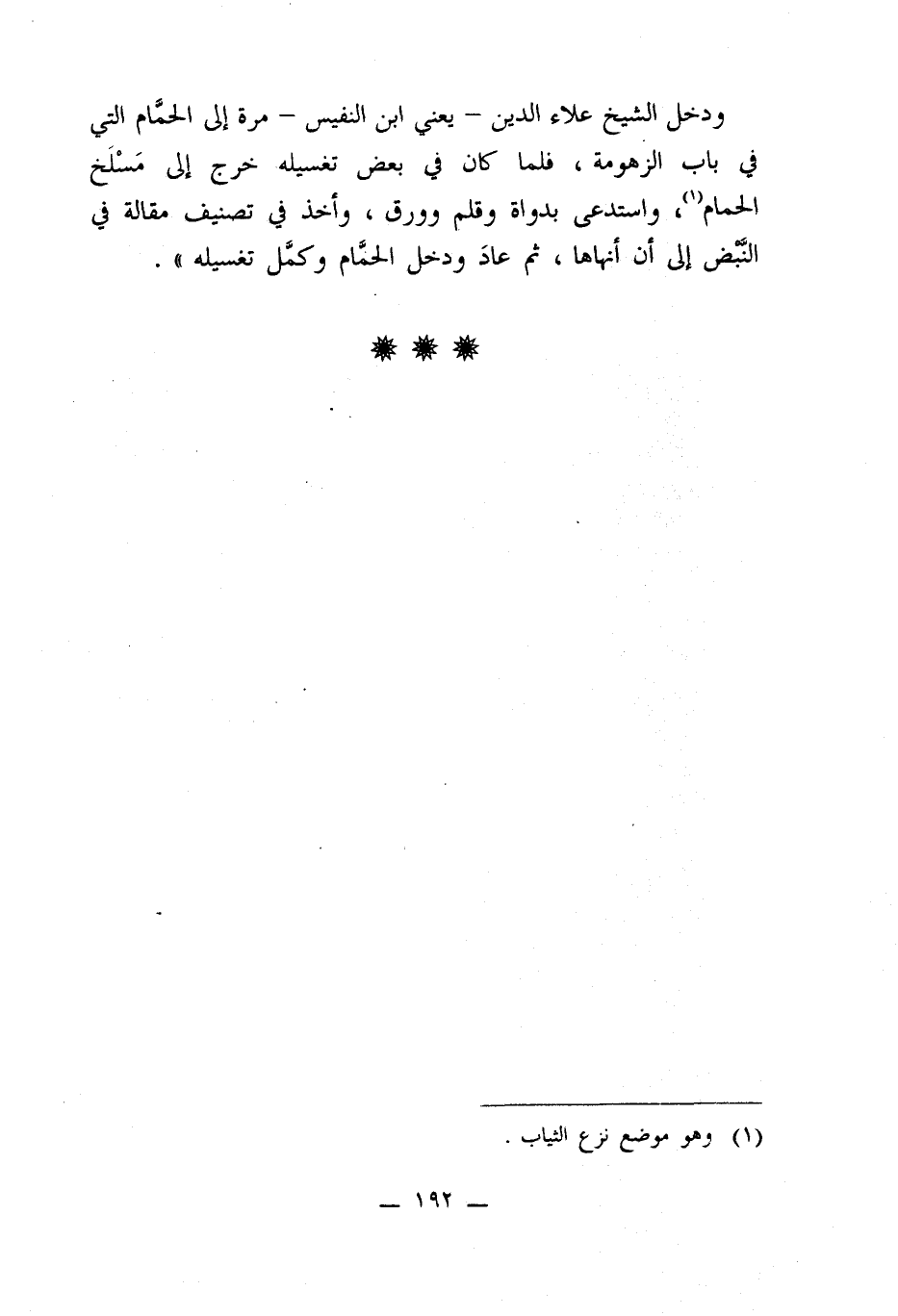 ودخل الشيخ علاء الدين -يعني ابن النفيس- مرة إلى الحمَّام التي في باب الزهومة، فلما كان في بعض تغسيله خرج إلى مَسْلَخ الحمام (¬1)، واستدعى بدواة وقلم وورق، وأخذ في تصنيف مقالة في النَّبْض إلى أن أنهاها، ثم عادَ ودخل الحمَّام وكمَّل تغسيله".