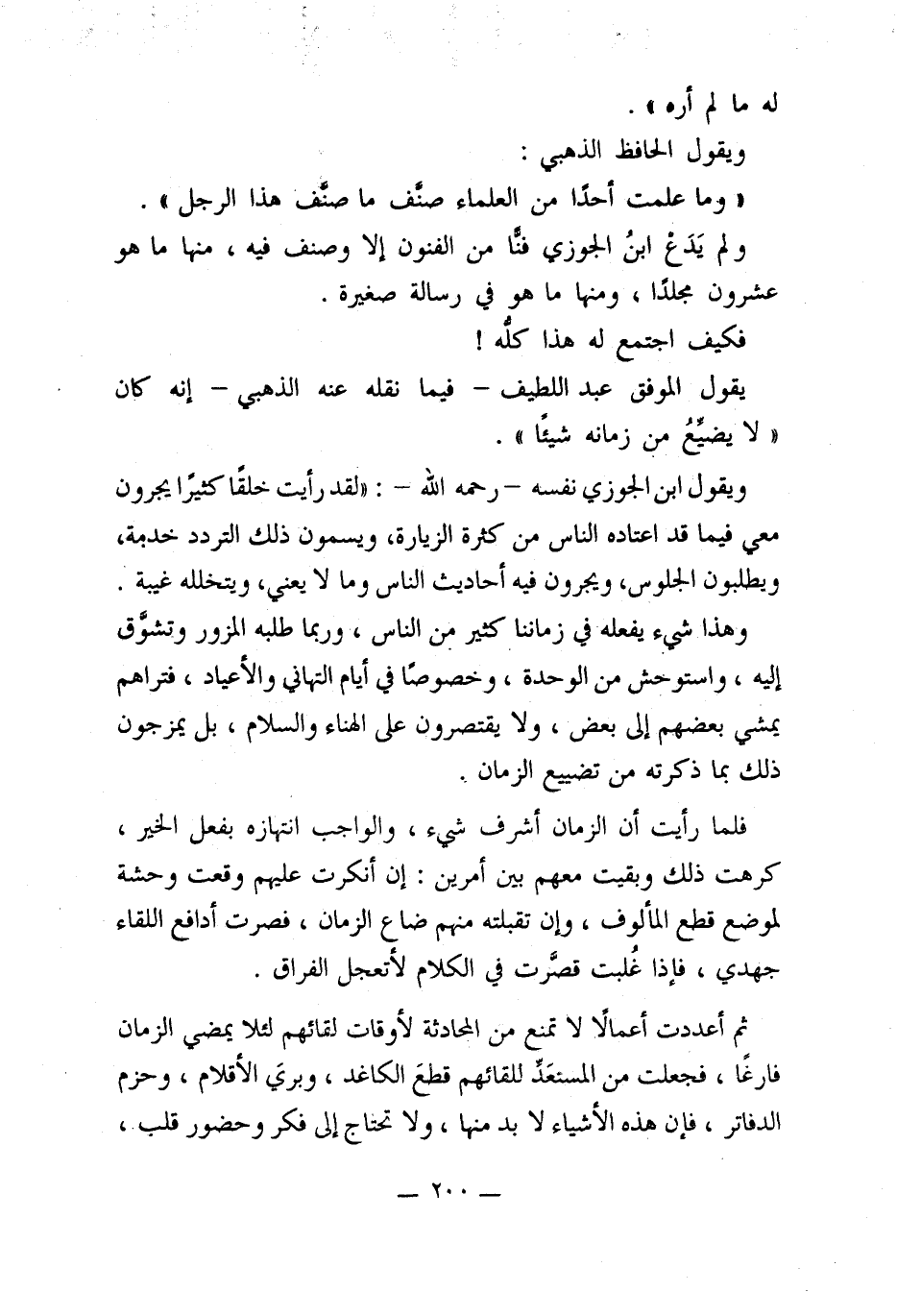 ويقول ابن الجوزي نفسه -رحمه الله-: "لقد رأيت خلقًا كثيرًا يجرون معي فيما قد اعتاده الناس من كثرة الزيارة، ويسمون ذلك التردد خدمة، ويطلبون الجلوس، ويجرون فيه أحاديث الناس وما لا يعني، ويتخلله غيبة.