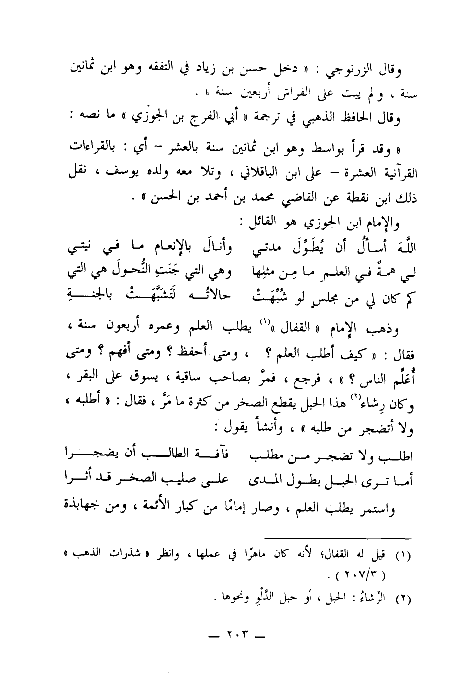 وذهب الإمام "القفال" (¬1) يطلب العلم وعمره أربعون سنة، فقال: "كيف أطلب العلم؟، ومتى أحفظ؟ ومَتى أفهم؟ ومتى أعَلِّم الناس؟ "، فرجع، فمرَّ بصاحب ساقية، يسوق على البقر، وكان رِشاء (¬2) هذا الحبل يقطع الصخر من كثرة ما مَرَّ، فقال: "أطلبه، ولا أتضجر من طلبه"، وأنشأ يقول: