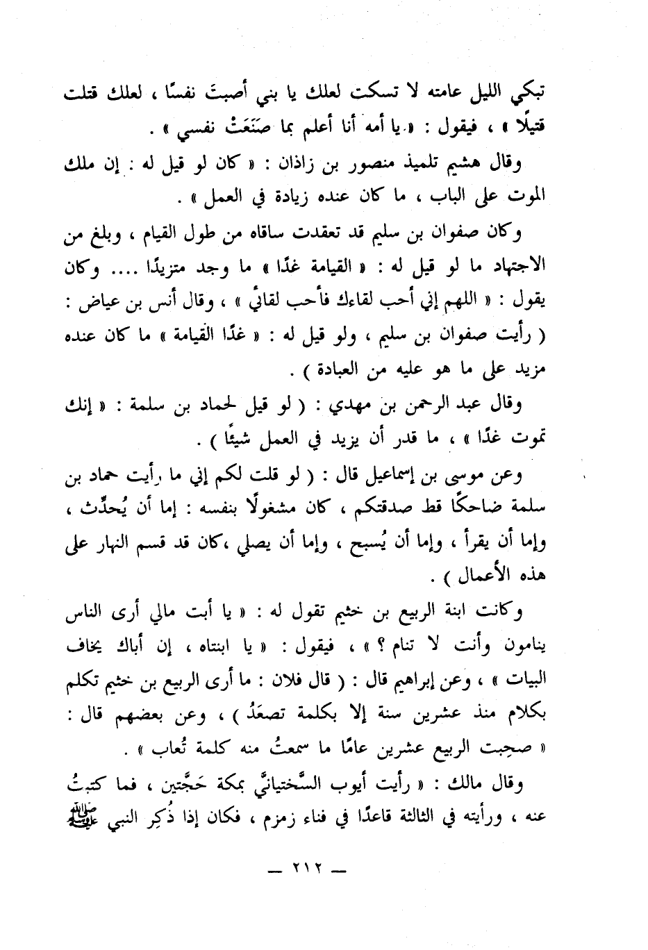 وكان صفوان بن سليم قد تعقدت ساقاه من طول القيام، وبلغ من الاجتهاد ما لو قيل له: "القيامة غدًا" ما وجد متزيدًا. ... وكان يقول: "اللهم إني أحب لقاءك فأحب لقائي"، وقال أنس بن عياض: (رأيت صفوان بن سليم، ولو قيل له: "غدًا القيامة" ما كان عنده مزيد على ما هو عليه من العبادة).