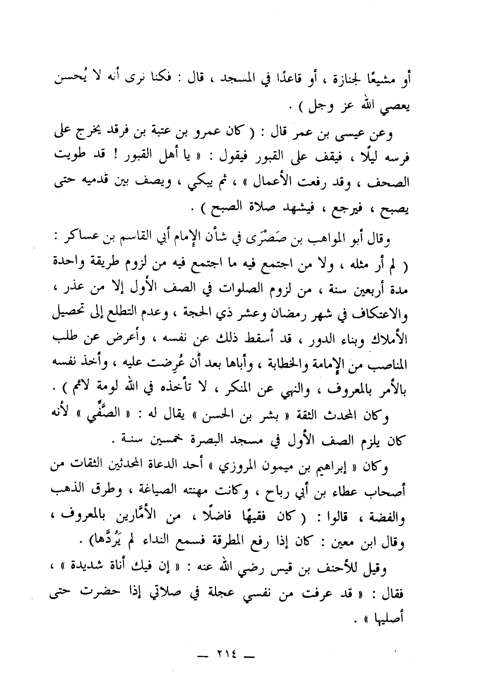 وعن عيسى بن عمر قال: (كان عمرو بن عتبة بن فرقد يخرج على فرسه ليلًا، فيقف على القبور فيقول: "يا أهل القبور! قد طويت الصحف، وقد رفعت الأعمال"، ثم يبكي، ويصف بين قدميه حتى يصبح، فيرجع، فيشهد صلاة الصبح).