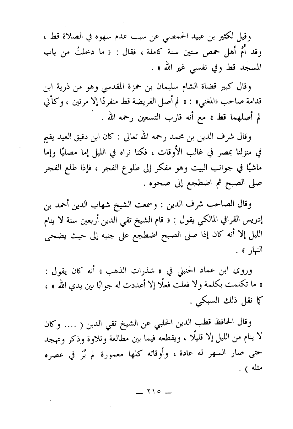 وقال الصاحب شرف الدين: وسمعت الشيخ شهاب الدين أحمد بن إدريِس القرافي المالكي يقول: "قام الشيخ تقي الدين أربعين سنة لا ينام الليل إلا أنه كان إذا صلى الصبح اضطجع على جنبه إلى حيث يضحى النهار".