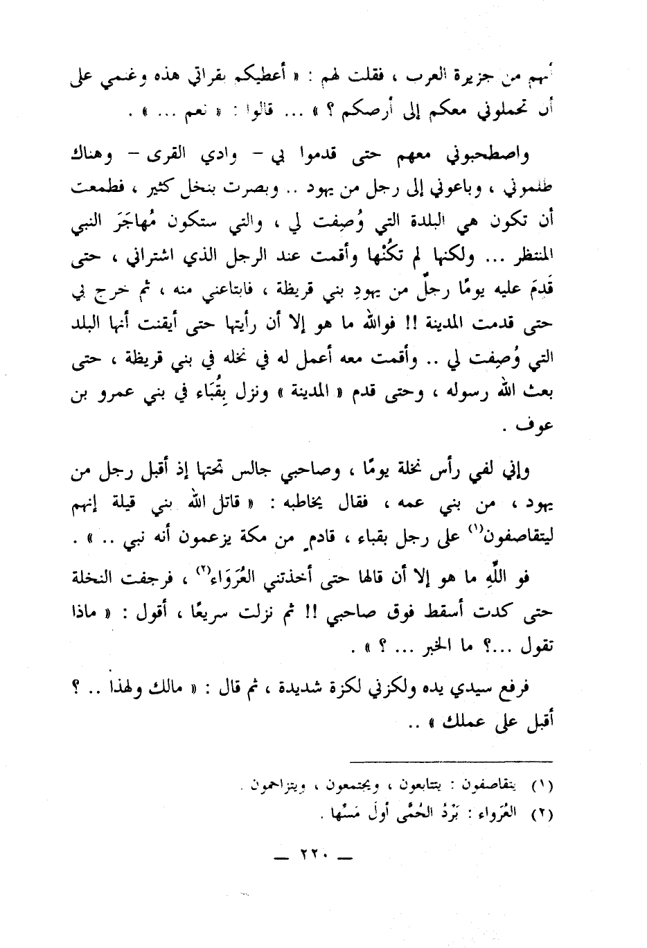 فو اللهِ ما هو إلا أن قالها حتى أخذتني العُرَوَاء (¬2)، فرجفت النخلة حتى كدت أسقط فوق صاحبي!! ثم نزلت سريعًا، أقول: "ماذا تقول ... ؟ ما الخبر ... ؟ ".