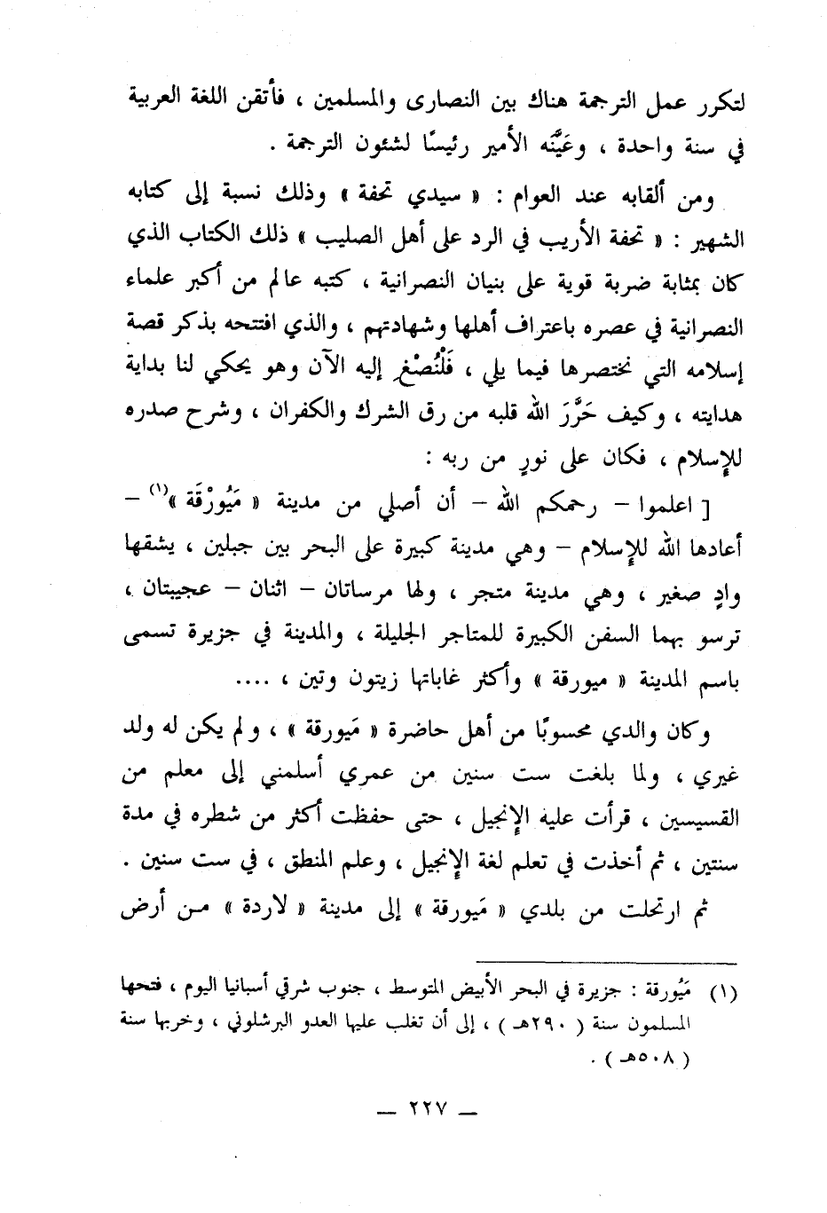 وكان والدى محسوبًا من أهل حاضرة "مَيورقة"، ولم يكن له ولد غيري، ولما بلغت ست سنين من عمري أسلمني إلى معلم من القسيسين، قرأت عليه الإنجيل، حتى حفظت أكثر من شطره في مدة سنتين، ثم أخذت في تعلم لغة الإنجيل، وعلم المنطق، في ست سنين.