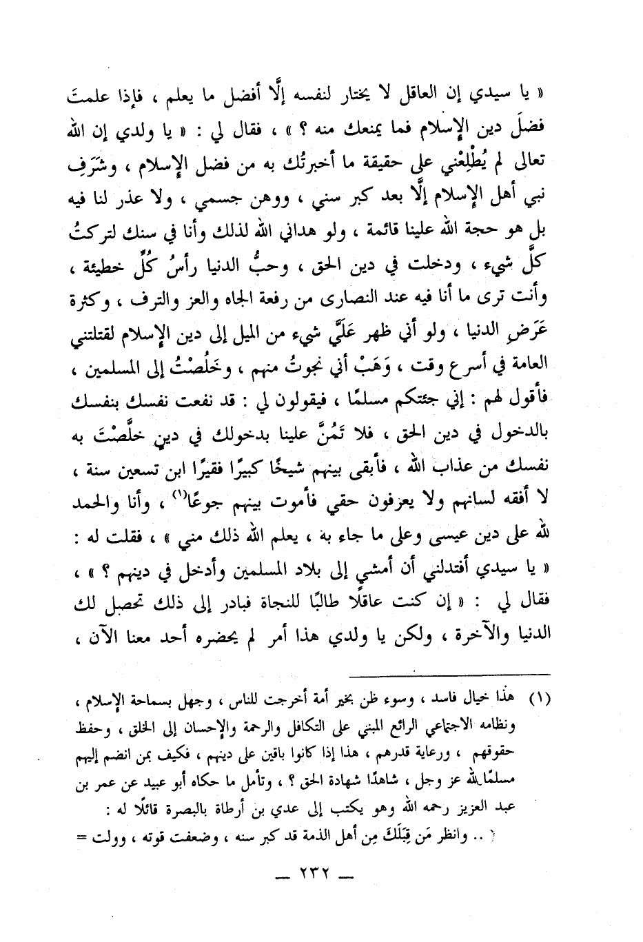 "يا سيدي إن العاقل لا يختار لنفسه إلَّا أفضل ما يعلم، فإذا علمتَ فضلَ دين الإسلام فما يمنعك منه؟ "، فقال لي: "يا ولدى إن الله تعالى لم يُطْلِعْني على حقيقة ما أخبرتُك به من فضل الإسلام، وشَرَفِ نبي أهل الإسلام إلَّا بعد كبر سني، ووهن جسمي، ولا عذر لنا فيه بل هو حجة الله علينا قائمة، ولو هداني الله لذلك وأنا في سنك لتركتُ كلَّ شيء، ودخلت في دين الحق، وحبُّ الدنيا رأسُ كُلِّ خطيئة، وأنت ترى ما أنا فيه عند النصارى من رفعة الجاه والعز والترف، وكثرة عَرَض الدنيا، ولو أني ظهر عَلَيَّ شيء من الميل إلى دين الإسلام لقتلتني العامة في أسرع وقت، وَهَبْ أني نجوتُ منهم، وخَلُصْتُ إلى المسلمين، فأقول لهم: إني جئتكم مسلمًا، فيقولون لي: قد نفعت نفسك بنفسك بالدخول في دين الحق، فلا تَمُنَّ علينا بدخولك في دين خلَّصْتَ به نفسك من عذاب الله، فأبقى بينهم شيخًا كبيرًا فقيرًا ابن تسعين سنة، لا أفقه لسانهم ولا يعرفون حقي فأموت بينهم جوعًا (¬1)، وأنا والحمد لله على دين عيسى وعلى ما جاء به، يعلم الله ذلك مني"، فقلت له: "يا سيدي أفتدلني أن أمشي إلى بلاد المسلمين وأدخل في دينهم؟ "، فقال لي: "إن كنت عاقلا طالبًا للنجاة فبادر إلى ذلك تحصل لك الدنيا والآخرة، ولكن يا ولدي هذا أمر لم يحضره أحد معنا الآن،