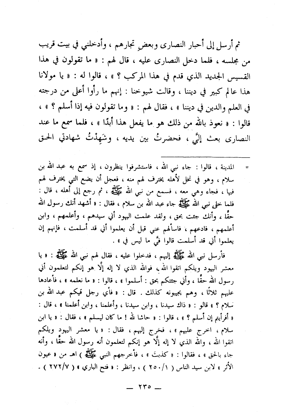 فأرسله نبي الله - صلى الله عليه وسلم - إليهم، فدخدوا عليه، فقال لهم نبي الله - صلى الله عليه وسلم-: "يا معشر اليهود ويلكم اتقوا الله، فوالله الذي لا إله إلا هو إنكم لتعلمون أني رسول الله حقًّا، وأني جئتكم بحق: أسلموا"، قالوا: "ما نعلمه"، فأعادها عليهم ثلاثًا، وهم يجيبونه كذلك. قال: "فأي رجل فيكم عبد الله بن سلام؟ " قالوا: "ذاك سيدنا، وابن سيدنا، وأعلمنا، وابن أعلمنا"، قال: "أفرأيتم إن أسلم؟ "، قالوا: "حاشا لله! ما كان ليسلم"، فقال: "يا ابن سلام، اخرج عليهم، فخرج إليهم، فقال: "يا معشر اليهود ويلكم اتقوا الله، والله الذي لا إله إلا هو إنكم لتعلمون أنه رسول الله حقًّا، وأنه جاء بالحق"، فقالوا: "كذبتَ"، فأخرجهم النبي - صلى الله عليه وسلم -) اهـ من "عيون الأثر" لابن سيد الناس (1/ 250)، وانظر: "فتح البارى" (7/ 272).