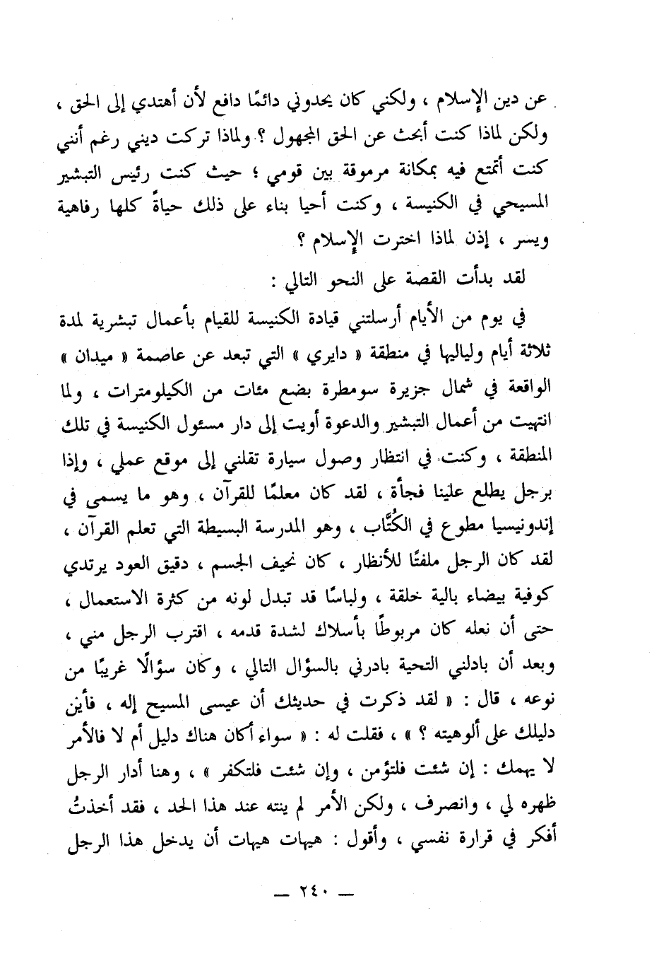 في يوم من الأيام أرسلتني قيادة الكنيسة للقيام بأعمال تبشيرية لمدة ثلالة أيام ولياليها في منطقة "دايري" التي تبعد عن عاصمة "ميدان" الواقعة في شمال جزيرة سومطرة بضع مئات من الكيلومترات، ولما انتهيت من أعمال التبشير والدعوة أويتَ إلى دار مسئول الكنيسة في تلك المنطقة، وكنت فِي انتظار وصول سيارة تقلني إلى موقع عملي، وإذا برجل يطلع علينا فجأة، لقد كان معلمًا للقرآن، وهو ما يسمى في إندونيسيا مطوع في الكُتَّاب، وهو المدرسة البسيطة التي تعلم القرآن، لقد كان الرجل ملفتًا للأنظار، كان نحيف الجسم، دقيق العود يرتدي كوفية بيضاء بالية خلقة، ولباسًا قد تبدل لونه من كثرة الاستعمال، حتى أن نعله كان مربوطًا بأسلاك لشدة قدمه، اقترب الرجل مني، وبعد أن بادلني التحية بادرني بالسؤال التالي، وكان سؤالًا غريبًا من نوعه، قال: "لقد ذكرت في حديثك أن عيسى المسيح إله، فأين دليلك على ألوهيته؟ "، فقلت له: "سواء أكان هناك دليل أم لا فالأمر لا يهمك: إن شئت فلتؤمن، وإن شئت فلتكفر"، وهنا أدار الرجل ظهره لي، وانصرف، ولكن الأمر لم ينته عند هذا الحد، فقد أخذتُ أفكر في قرارة نفسي، وأقول: هيهات هيهات أن يدخل هذا الرجل