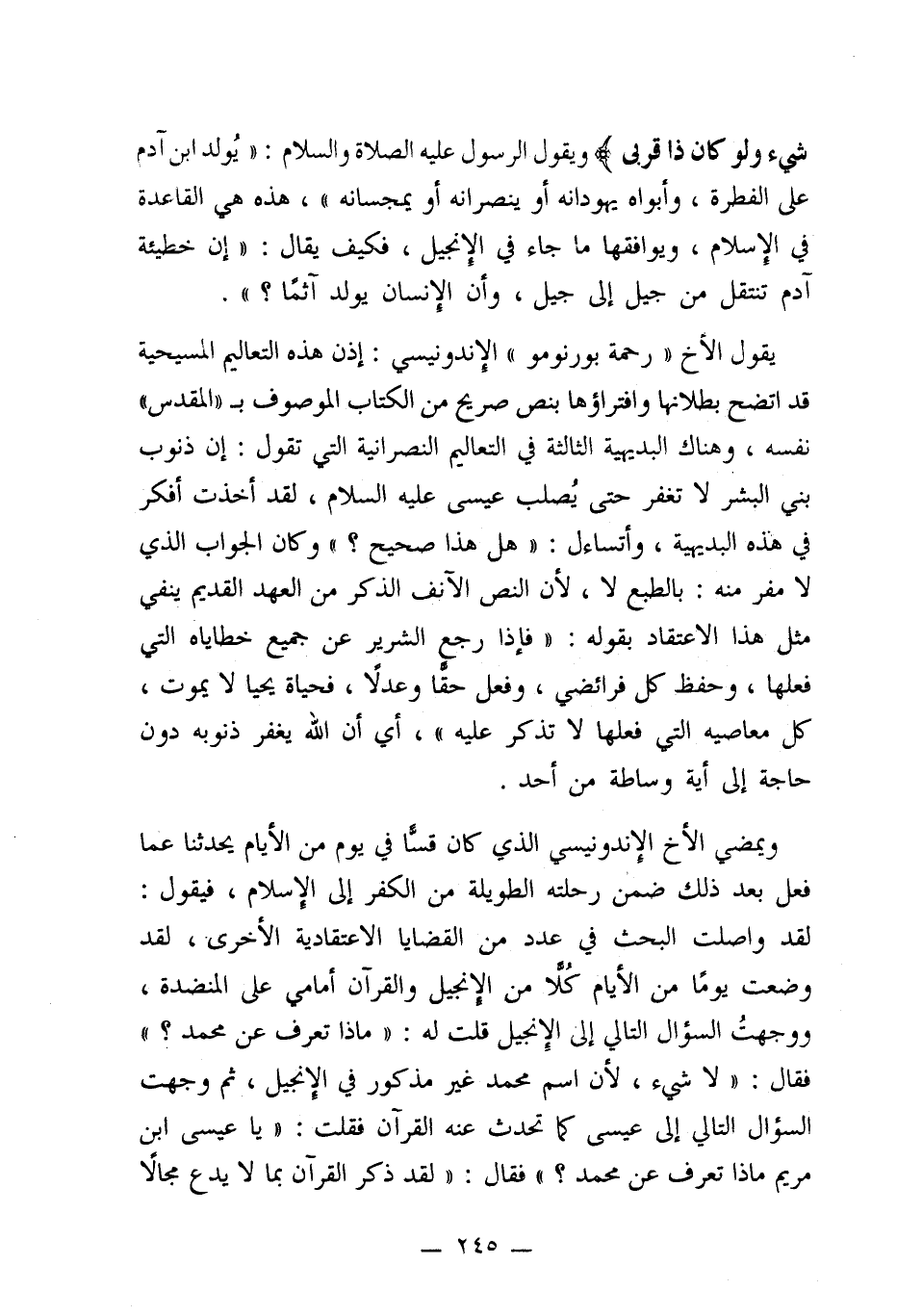 شيء ولو كان ذا قربى} ويقول الرسول عليه الصلاة والسلام: "يُولد ابن آدم على الفطرة، وأبواه يهودانه أو ينصرانه أو يمجسانه"، هذه هي القاعدة في الإسلام، ويوافقها ما جاء في الإنجيل، فكيف يقال: "إن خطيئة آدم تنتقل من جيل إلى جيل، وأن الإنسان يولد آثمًا؟ ".