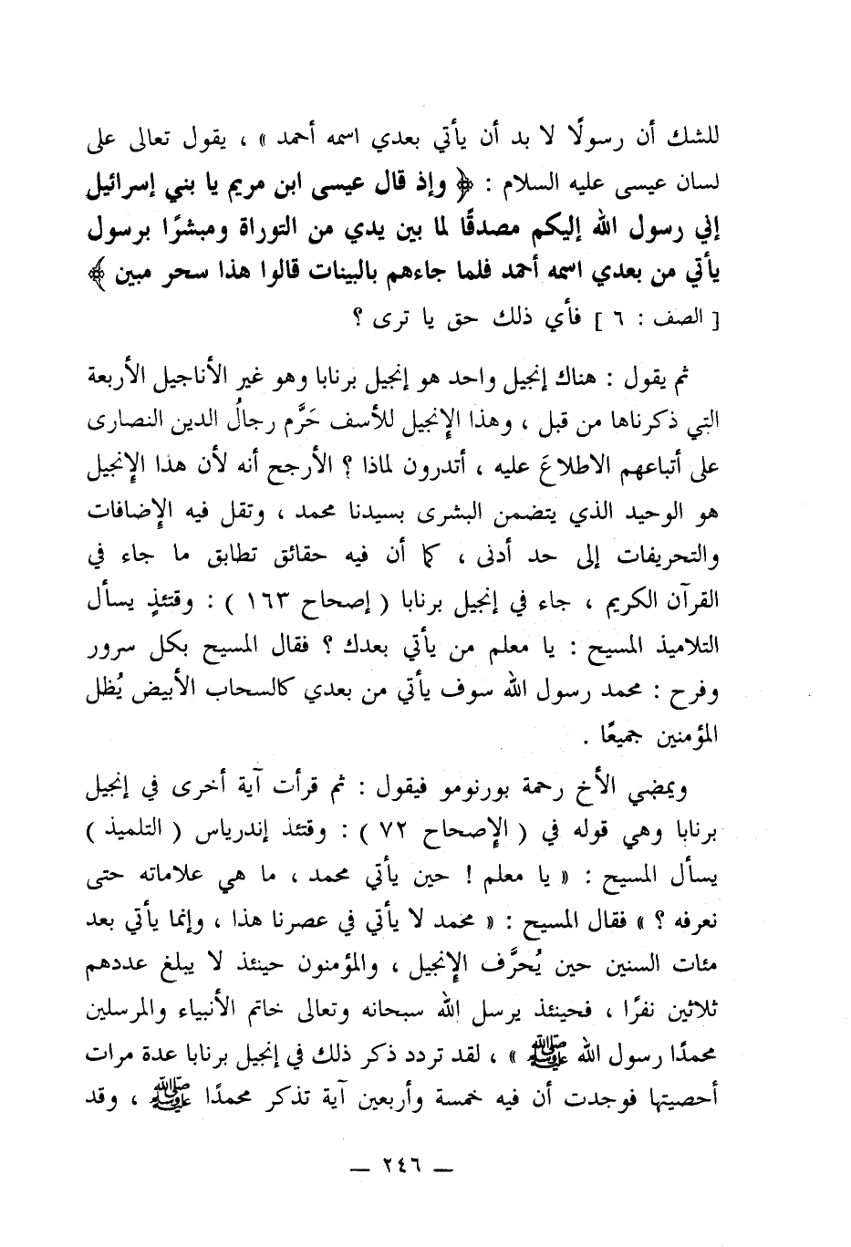 ثم يقول: هناك إنجيل واحد هو إنجيل برنابا وهو غير الأناجيل الأربعة التي ذكرناها من قبل، وهذا الإنجيل للأسف حَرَّم رجالُ الدين النصارى على أتباعهم الاطلاعَ عليه، أتدرون لماذا؟ الأرجح أنه لأن هذا الِإنجيل هو الوحيد الذي يتضمن البشرى بسيدنا محمد، وتقل فيه الِإضافات والتحريفات إلى حد أدنى، كما أن فيه حقائق تطابق ما جاء في القرآن الكريم، جاء في إنجيل برنابا (إصحاح 163): وقتئذٍ يسأل التلاميذ المسيح: يا معلم من يأتي بعدك؟ فقال المسيح بكل سرور وفرح: محمد رسول الله سوف يأتي من بعدي كالسحاب الأبيض يُظل المؤمنين جميعًا.