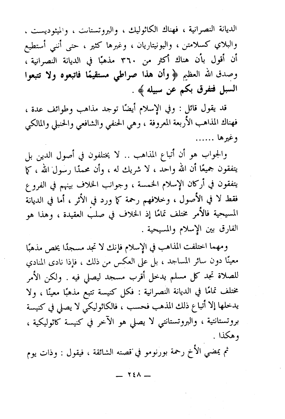 الديانة النصرانية، فهناك الكاثوليك، والبروتستانت، والميثوديست، والبلاي كسلامتن، واليونيتاريان، وغيرها كثير، حتىّ أنني أستطيع أن أقول بأن هناك أكثر من 360 مذهبًا في الديانة النصرانية، وصدق الله العظيم {وأن هذا صراطي مستقيمًا فاتبعوه ولا تتبعوا السبل فتفرق بكم عن سبيله}.