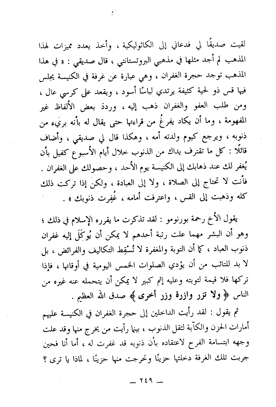 لقيت صديقًا لي فدعاني إلى الكاثوليكية، وأخذ يعدد مميزات لهذا المذهب لم أجد مثلها في مذهبي البروتستانتي، قال صديقي: "في هذا المذهب توجد حجرة الغفران، وهي عبارة عن غرفة في الكنيسة يجلس فيها قس ذو لحية كثيفة يرتدي لباسًا أسود، ويقعد على كرسي عال، ومن طلب العفو والغفران ذهب إليه، ورددَ بعض الألفاظ غير المفهومة، وما أن يكاد يفرغُ من قراءتها حتى يقال له بأنه بريء من ذنوبه، ويرجع كيوم ولدته أمه، وهكذا قال لي صديقي، وأضاف قائلاً: كل ما تقترف يداك من الذنوب خلال أيام الأسبوع كفيل بأن يُغفر لك عند ذهابك إلى الكنيسة يوم الأحد، وحصولك على الغفران. فأنت لا تحتاج إلى الصلاة، ولا إلى العبادة، ولكن إذا تركت ذلك كله وذهبت إلى القس، واعترفت أمامه، غُفِرت ذنوبك".