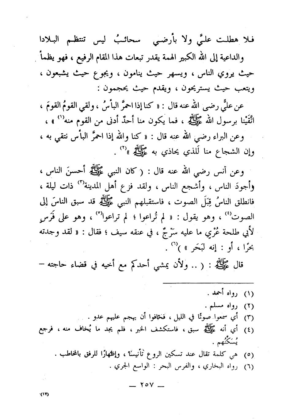 وعن أنس رضي الله عنه قال: (كان النبي - صلى الله عليه وسلم - أحسنَ الناس، وأجودَ الناس، وأشجع الناس، ولقد فزع أهل المدينة (¬3) ذات ليلة، فانطلق الناسُ قِبَلَ الصوت، فاستقبلهم النبي - صلى الله عليه وسلم - قد سبق الناسَ إلى الصوت (¬4)، وهو يقول: "لم تُراعوا؛ لم تراعوا (¬5)، وهو على فَرَسٍ لأبي طلحة عُرْيٍ ما عليه سَرْجٌ، فِي عنقه سيف؛ فقال: "لقد وجدته بحرًا، أو: إنه لبَحَر") (¬6).