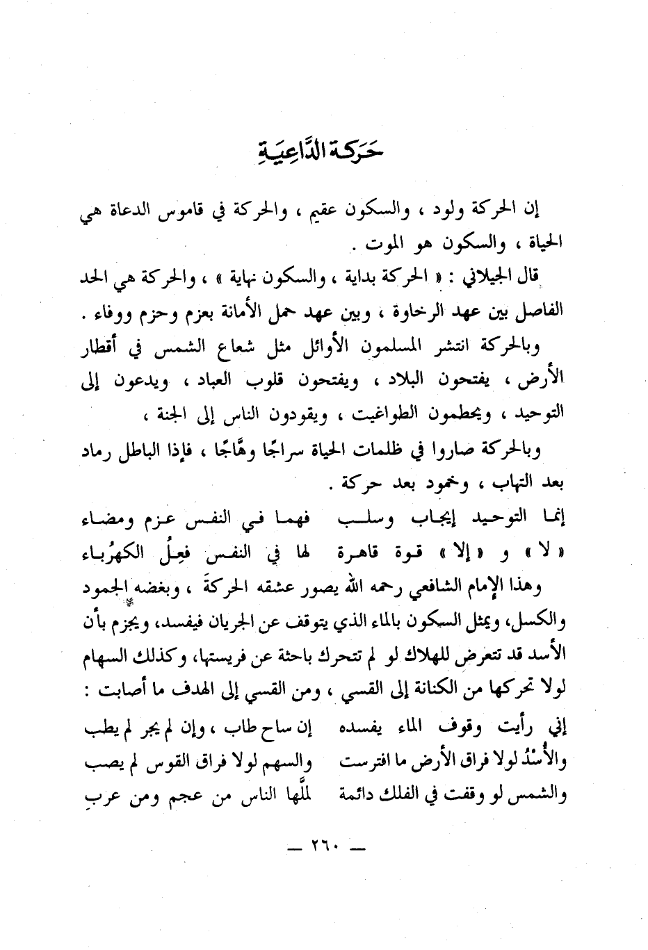 وهذا الإمام الشافعي رحمه الله يصور عشقه الحركةَ، وبغضه الجمود والكسل، ويمثل السكون بالماء الذي يتوقف عن الجريان فيفسد، ويجزم بأن الأسد قد تتعرض للهلاك لو لم تتحرك باحثة عن فريستها، وكذلك السهام لولا تحركها من الكنانة إلى القسي، ومن القسي إلى الهدف ما أصابت: