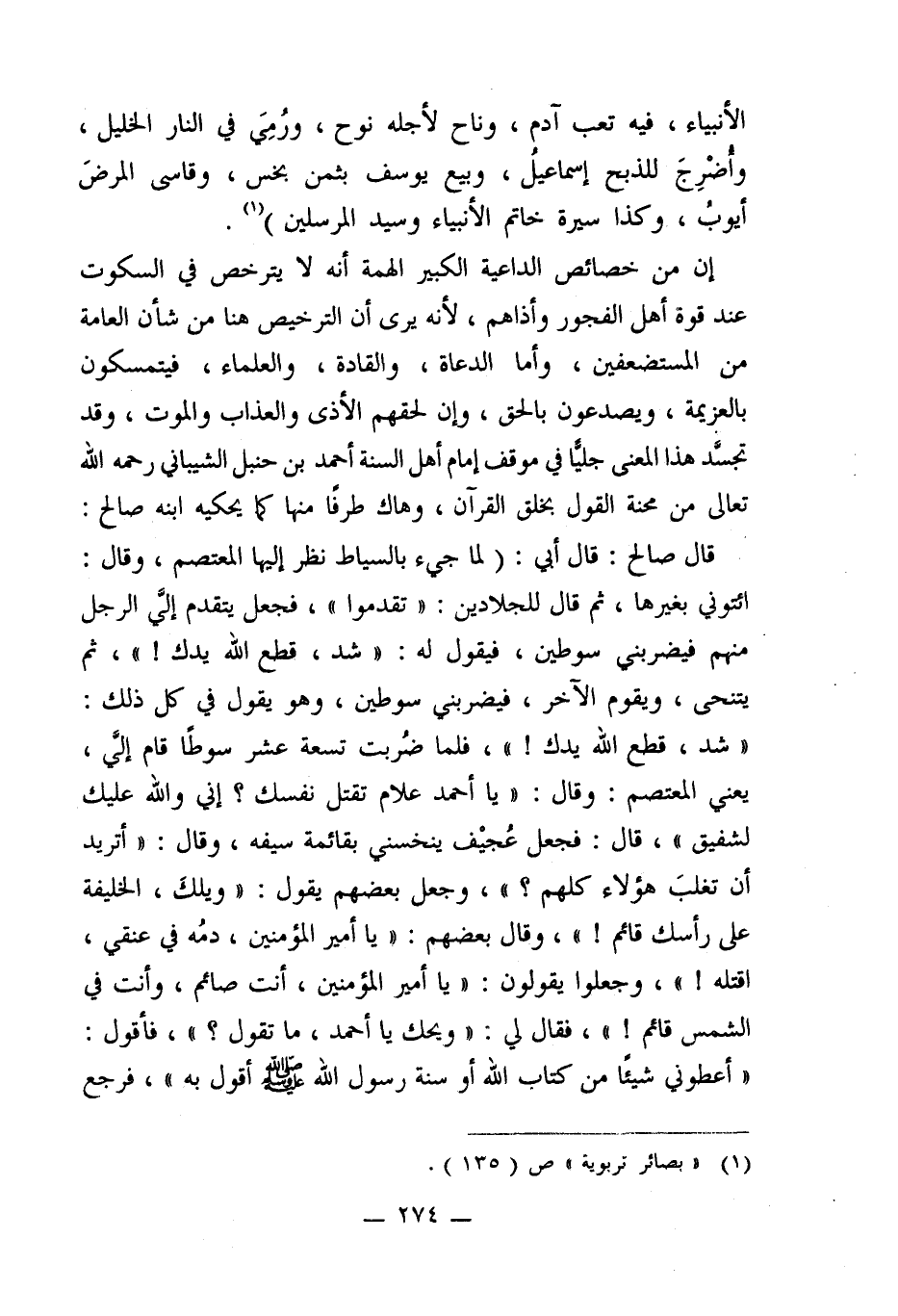 قال صالح: قال أبي: (لما جيء بالسياط نظر إليها المعتصم، وقال: ائتوني بغيِرها، ثم قال للجلادين: "تقدموا"، فجعل يتقدم إليَّ الرجل منهم فيضربني سوطين، فيقول له: "شد، قطع الله يدك! "، ثم يتنحى، ويقوم الآخر، فيضربني سوطين، وهو يقول في كل ذلك: "شد، قطع الله يدك! "، فلما ضُربت تسعة عشر سوطًا قام إليَّ، يعني المعتصم: وقال: "يا أحمد علام تقتل نفسك؟ إني والله عليك لشفيق"، قال: فجعل عُجيْف ينخسني بقائمة سيفه، وقال: "أتريد أن تغلبَ هؤلاء كلهم؟ "، وجعل بعضهم يقول: "ويلكَ، الخليفة على رأسك قائم! "، وقال بعضهم: "يا أمير المؤمنين، دمُه في عنقي، اقتله! "، وجعلوا يقولون: "يا أمير المؤمنين، أنت صائم، وأنت في الشمس قائم! "، فقال لي: "ويحك يا أحمد، ما تقول؟ "، فأقول: "أعطوني شيئًا من كتاب الله أو سنة رسول الله - صلى الله عليه وسلم - أقول به"، فرجع